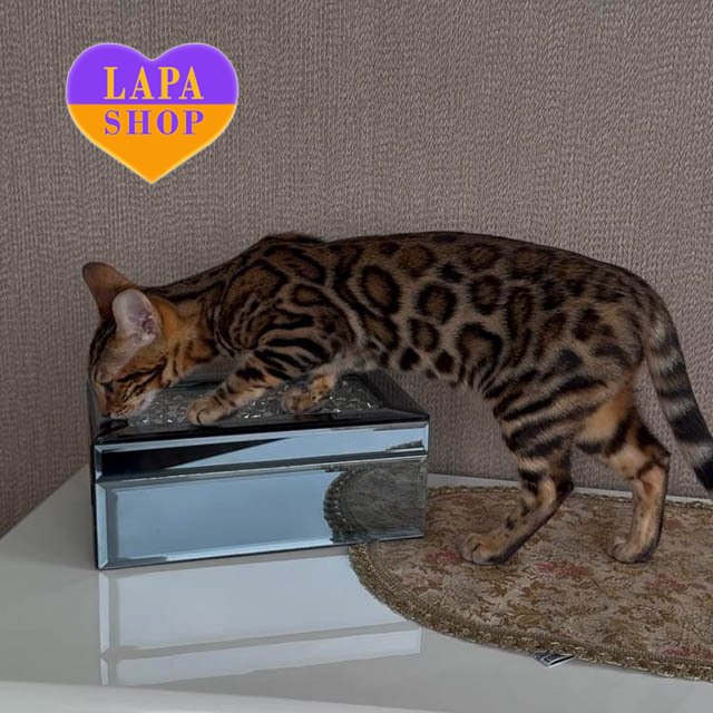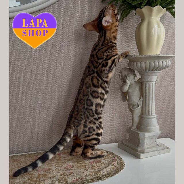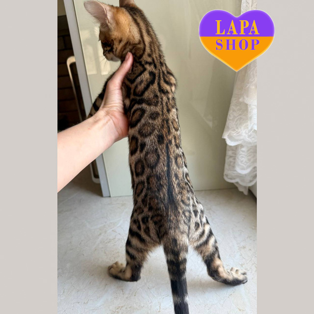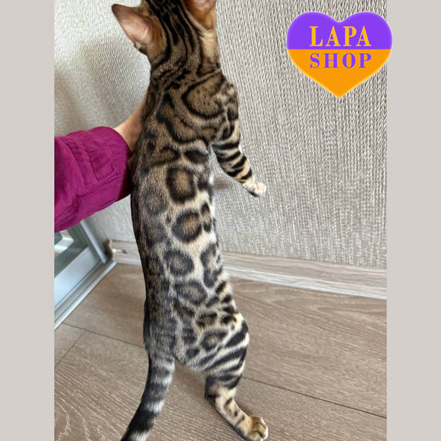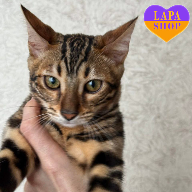 Bonya – настоящая красавица с изящной окраской розетка на золоте (n 24), напоминающая драгоценный леопардовый рисунок. Ее шерсть переливается теплыми золотыми тонами, удачно подчеркивающимися четкими контрастными «розетками». Благодаря генетическому носительству снежного окраса ее внешность имеет особую неповторимость и шарм.