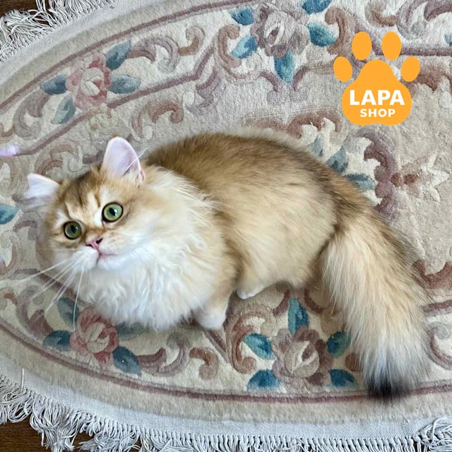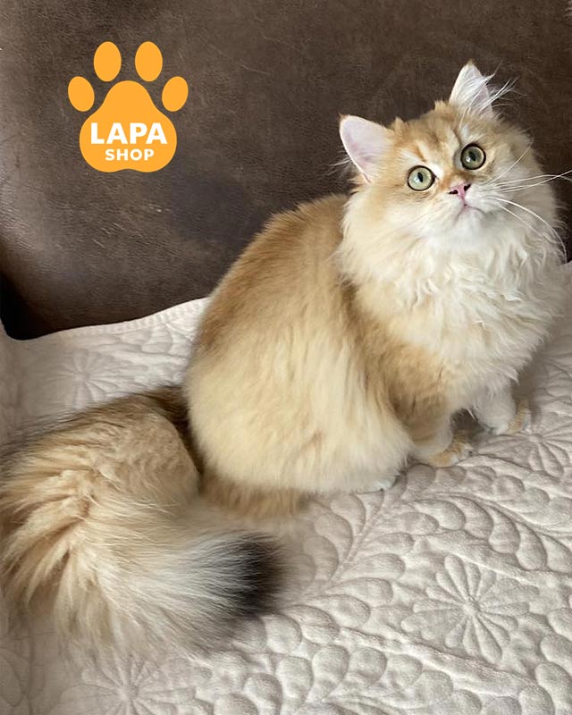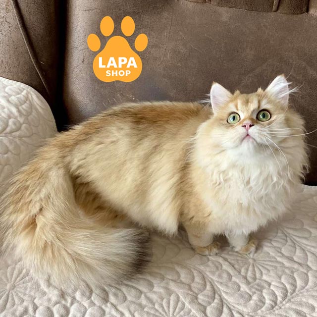Его густой пушистый мех имеет золотой окрас, мягко переливающийся в свете, а большие глаза завораживают с первого взгляда.