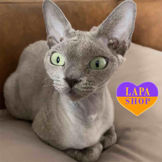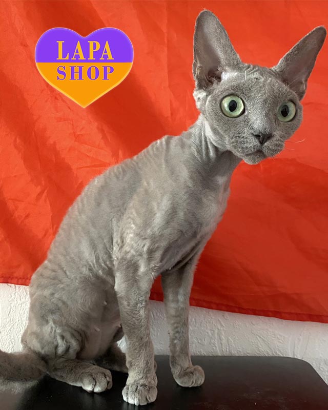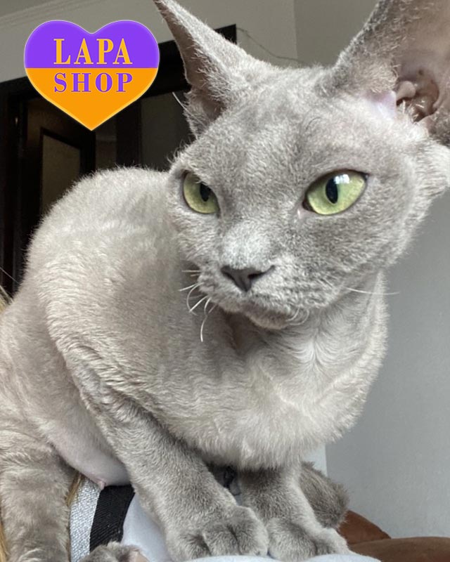 Очаровательная девочка Bella – настоящая жемчужина породы девон-рекс с голубым солидным окрасом. Она имеет бархатную волнистую шерсть и большие выразительные глаза, которые сразу пленяют сердце.