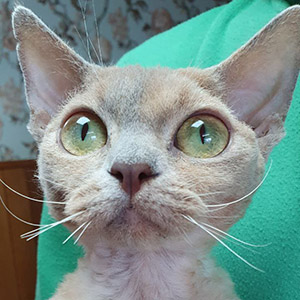 Ivan — милый котик породы девон-рекс в нежном лиловом колор пойнт ван окрасе. Его шелковистая волнистая шерсть и выразительные черты мордашки придают ему особый шарм. Этот маленький красавец обязательно покорит ваше сердце своим изяществом и уникальным видом.