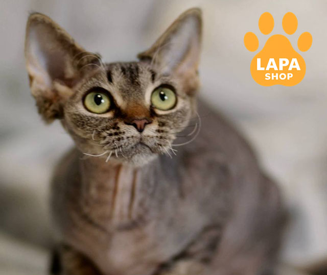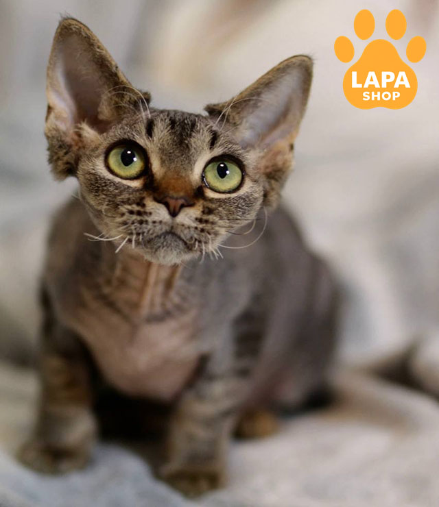 Kate привлекает внимание эффектным черным пятнистым окрасом, который выглядит контрастно и очень отчетливо на ее волнистой шерсти. Необычная текстура меха и большие ушки придают ей яркую породную харизму.