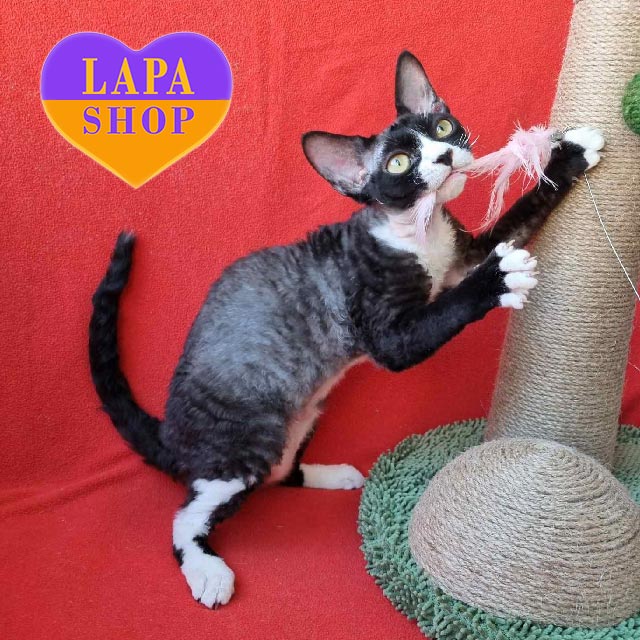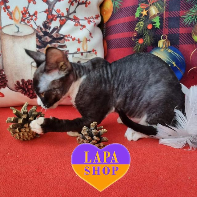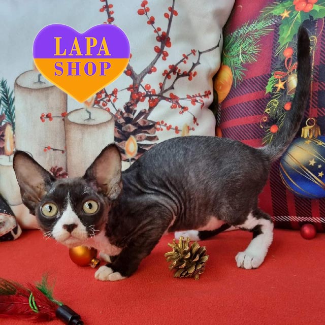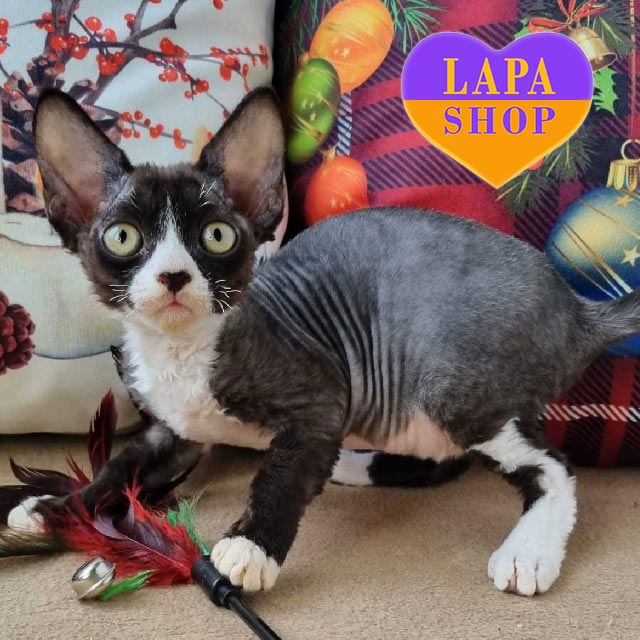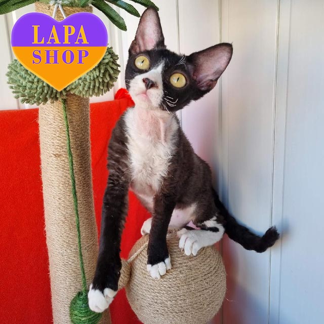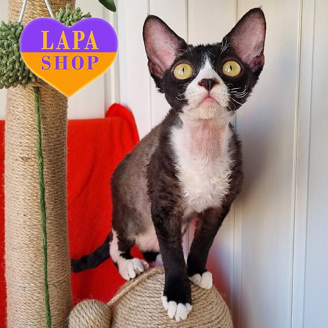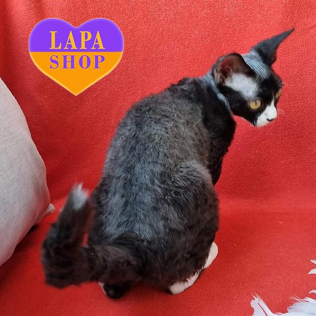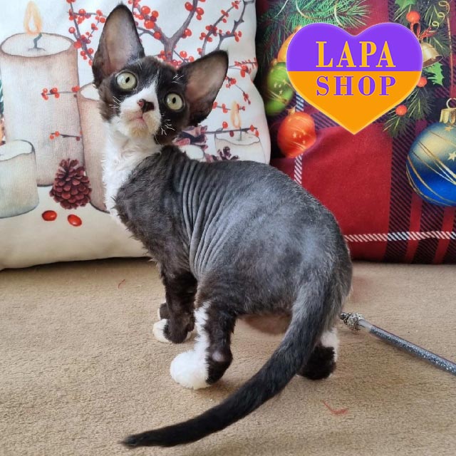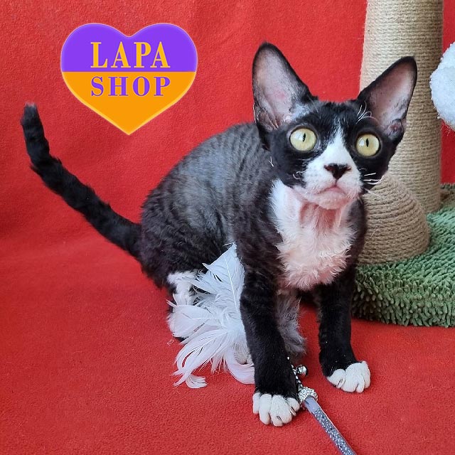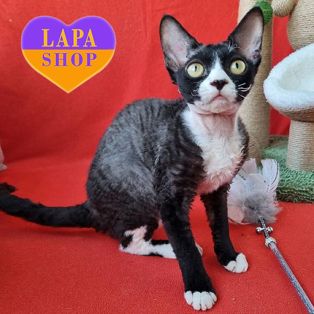 Oda – кошечка девон-рекс, которая имеет элегантный окрас черный биколор (n 03). Ее шерсть сочетает насыщенный черный цвет с белыми участками, гармонично расположенными на ее мордашке, лапках и груди.