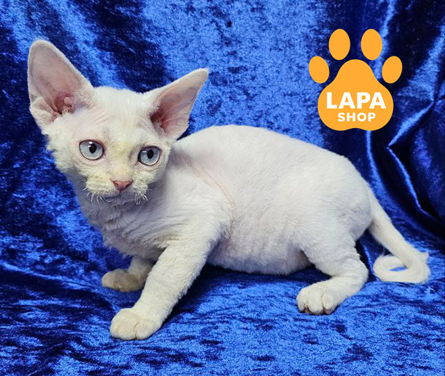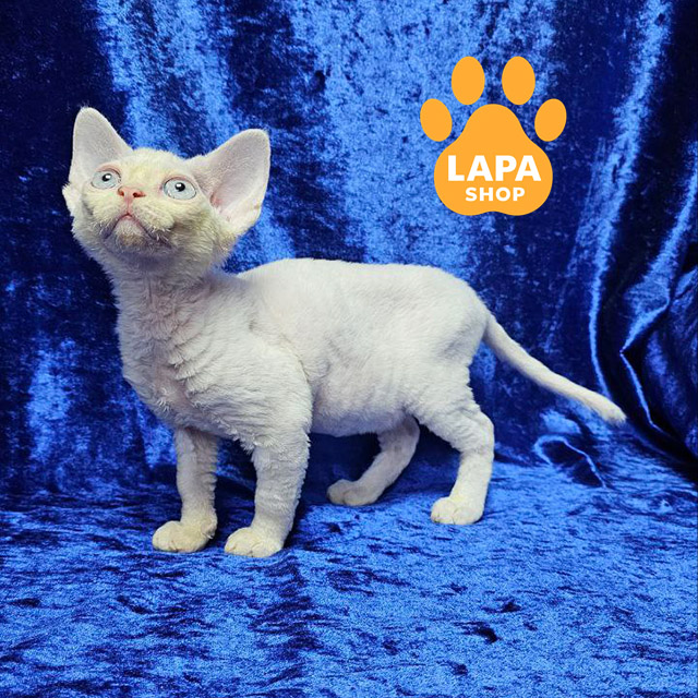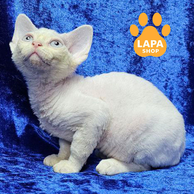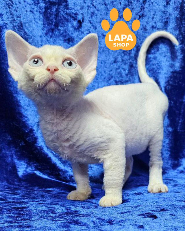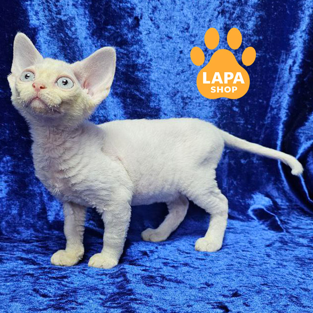 Izzy – нежная кошечка породы девон-рекс с роскошным белым окрасом и ярко-голубыми глазами. Ее короткая волнистая шерсть придает вид особого шарма, а изящная осанка делает ее настоящей леди. Каждый ее взгляд полон очарования и грации.