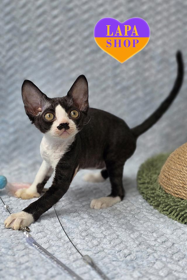 Wanessa — милая девочка породы девон-рекс с контрастным черным биколорным окрасом (n 03) и шелковистыми волнистыми кудрями, которые делают ее похожей на маленькую сказочную принцессу.