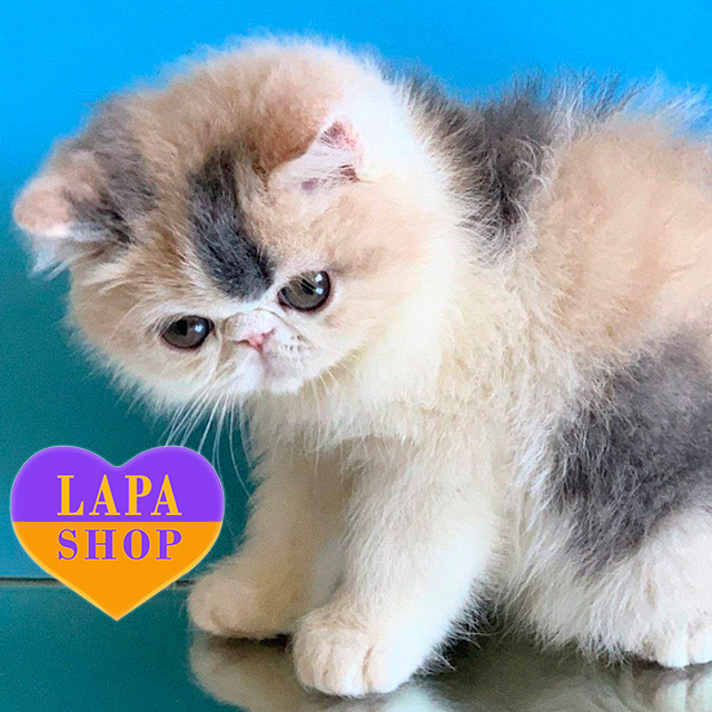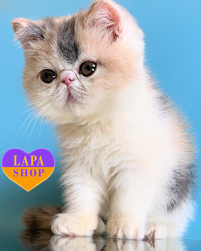 Жанна – очаровательная представительница породы экзот, завораживающая своим мягким плюшевым мехом и голубовато-кремовым черепаховым окрасом на белом фоне. Ее округлая мордашка и спокойный взгляд придают образу особой нежности.