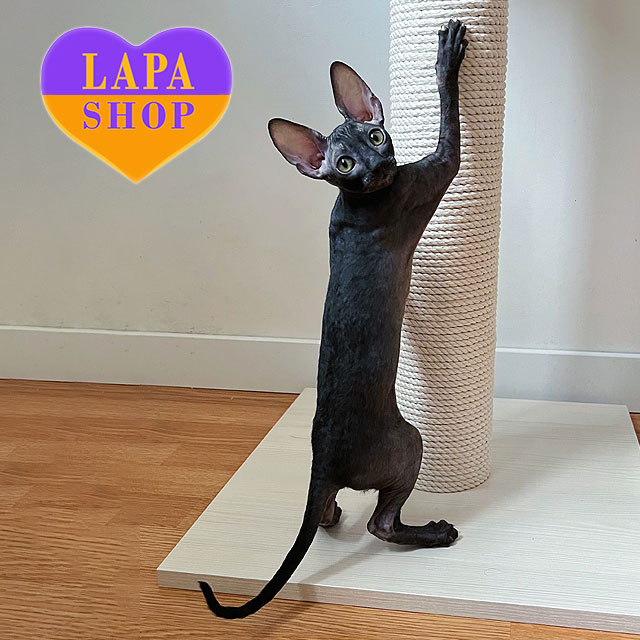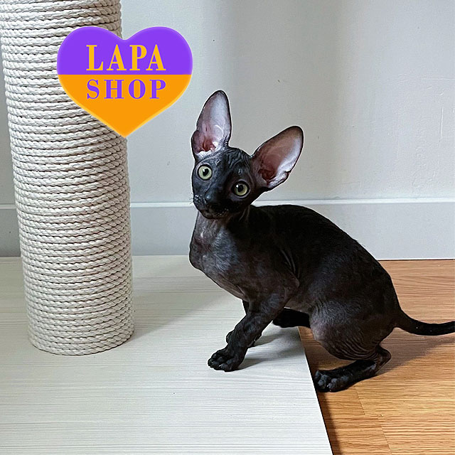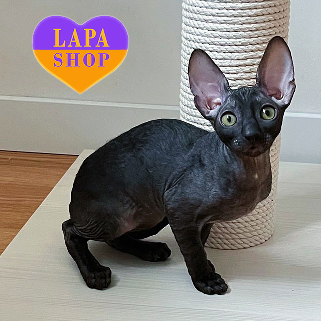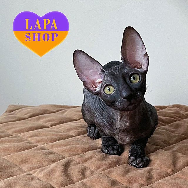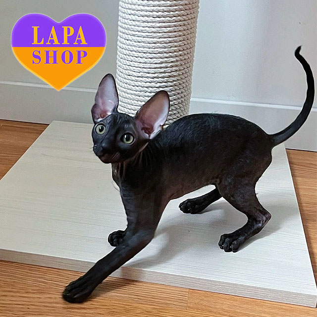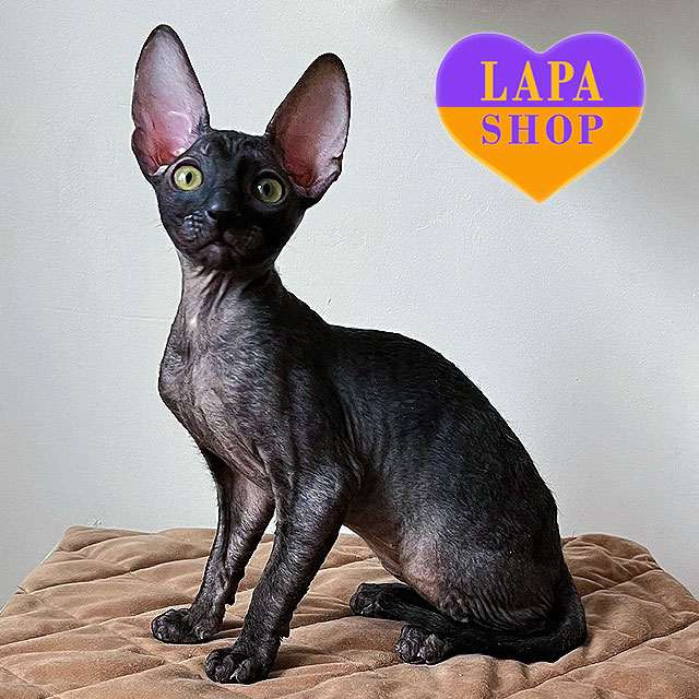 Frida (Фрида) – очаровательная девочка породы корниш-рекс с блестящей черной шерстью и нежной белой точечкой на груди.