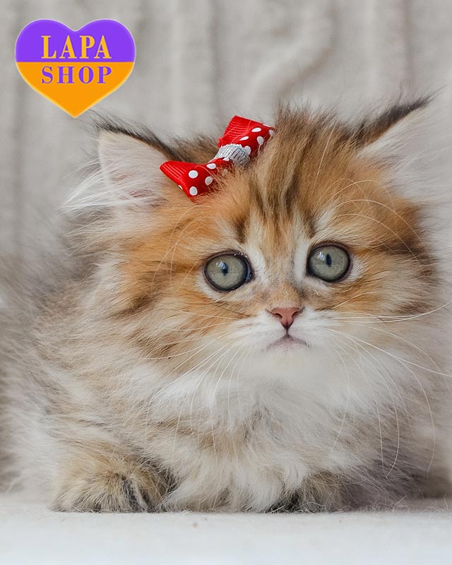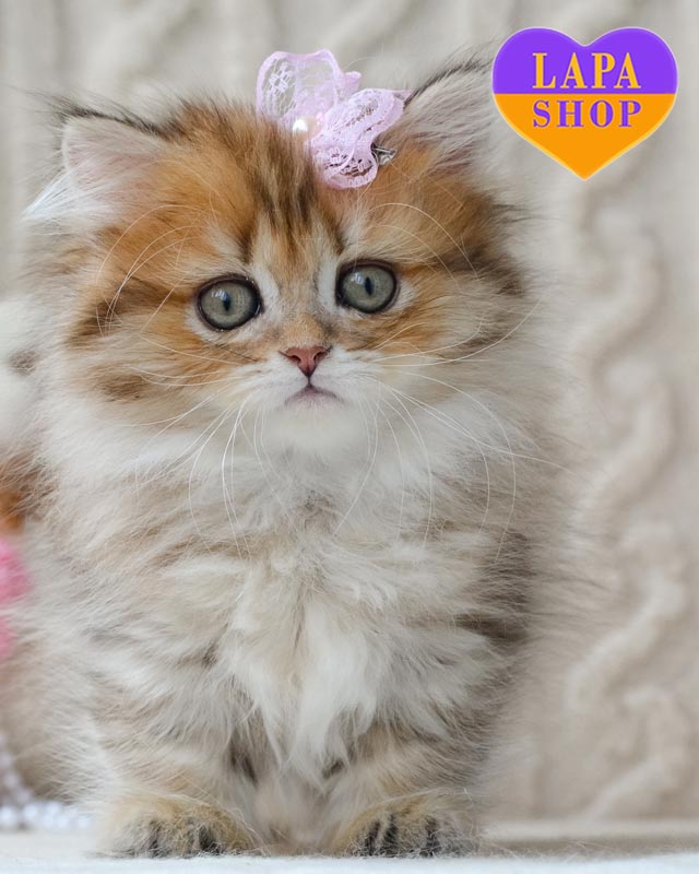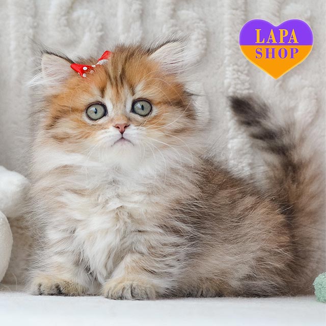 Fluffy – маленькая девочка манчкин с коротенькими лапками и длинной шелковистой шерстью золотого пятнистого окраса.