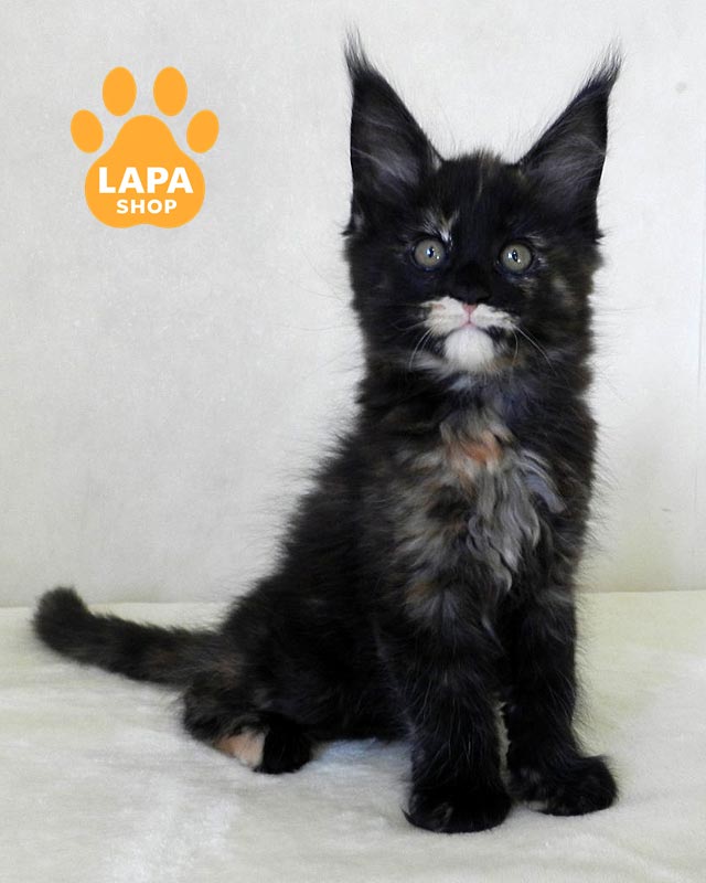 Adelle — девочка породы мейн-кун с эффектным черным черепаховым окрасом (f), в котором гармонично переплетается черный цвет и более светлые оттенки.
