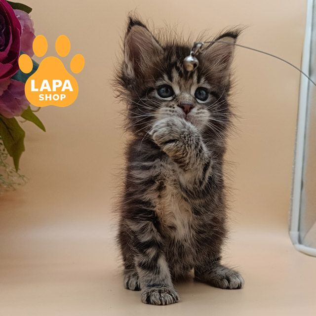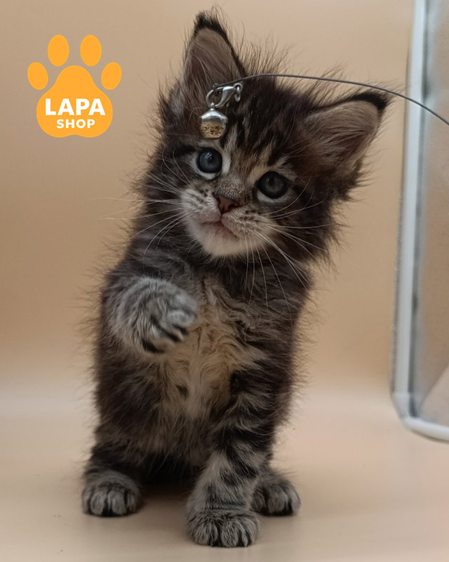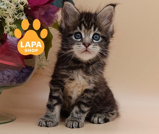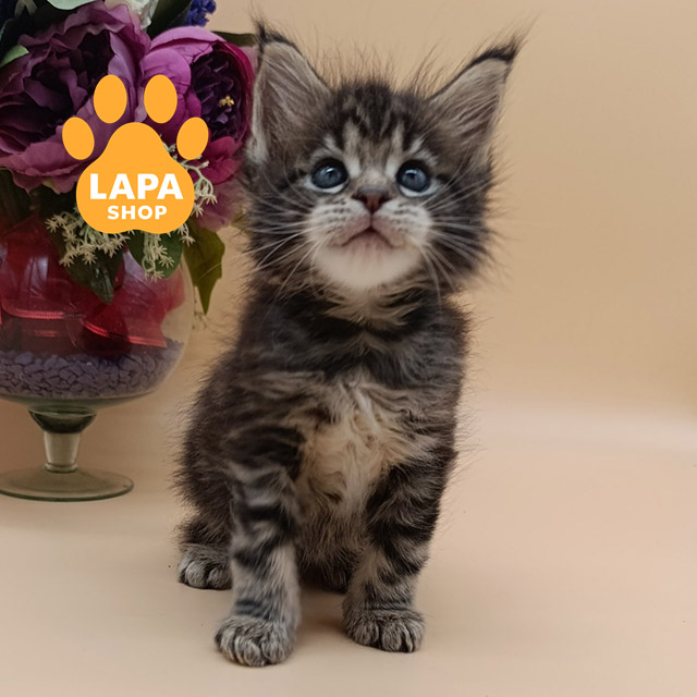 Diamond – величественный красавец породы мейн-кун с привлекательным черным серебристо-мраморным окрасом. Его шерсть имеет глубокий контрастный рисунок, подчеркивающий мускулистое и гармоническое телосложение. Огромные лапы и роскошный хвост делают его внешний вид особенно эффектным.