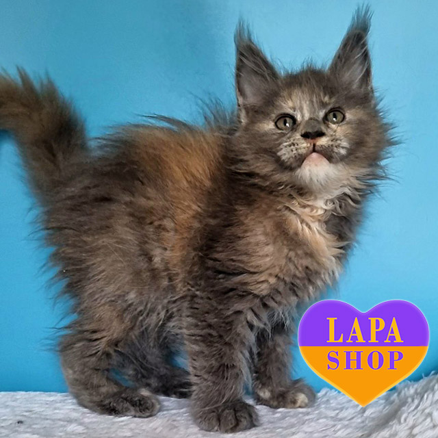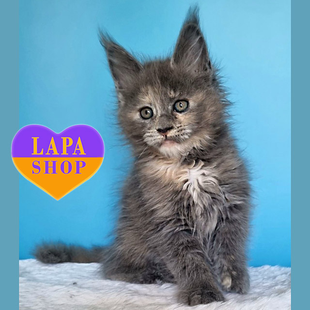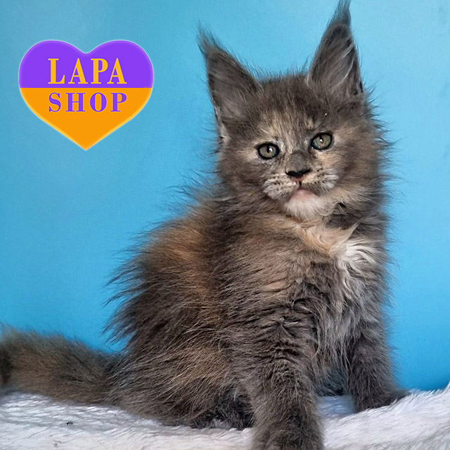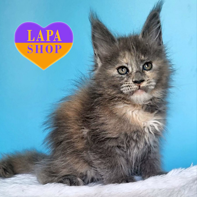 Greta – великолепная мейн-кун кошечка с голубой черепаховой окраской. Ее невероятно красивая внешность и нежный вид сделают ее идеальным другом для вашей семьи.