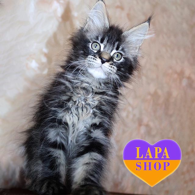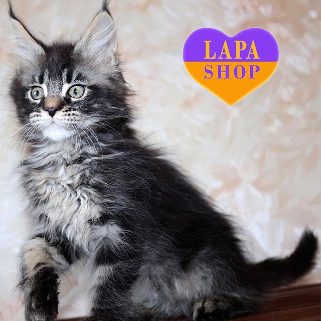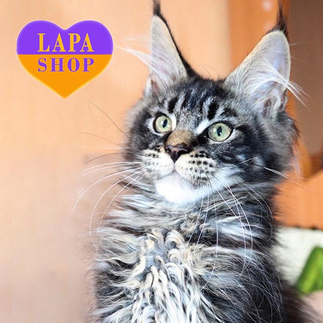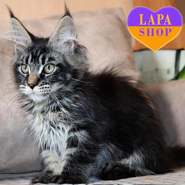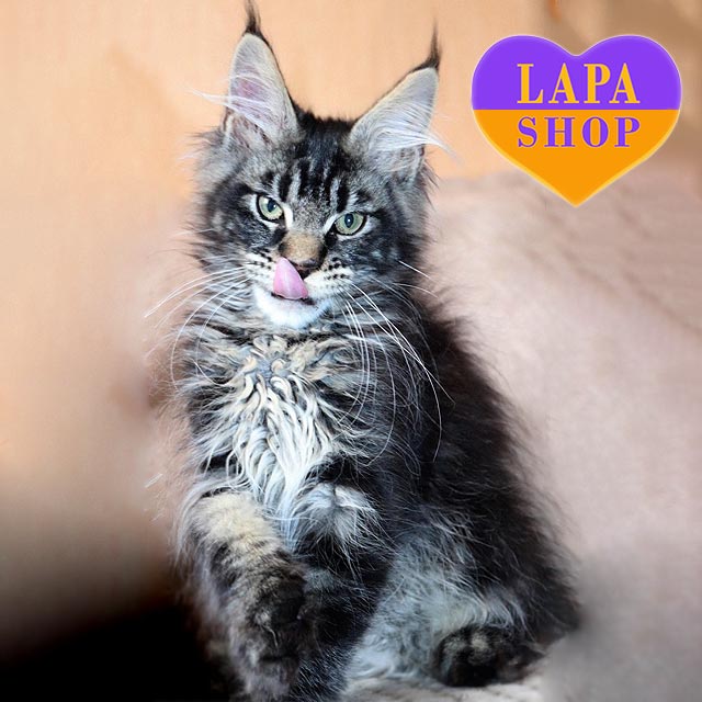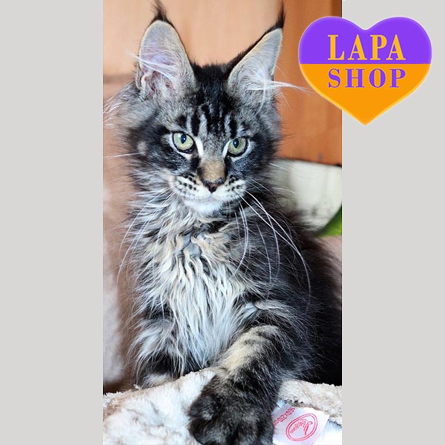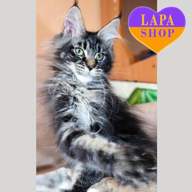 Irbis — роскошный мейн-кун в классическом черном мраморном окрасе (n 22). У него большие лапки, роскошная мордашка и выразительный рисунок шерсти — все, что нужно перспективному котику для разведения.