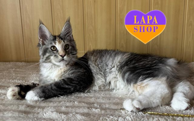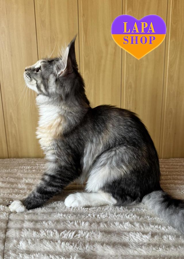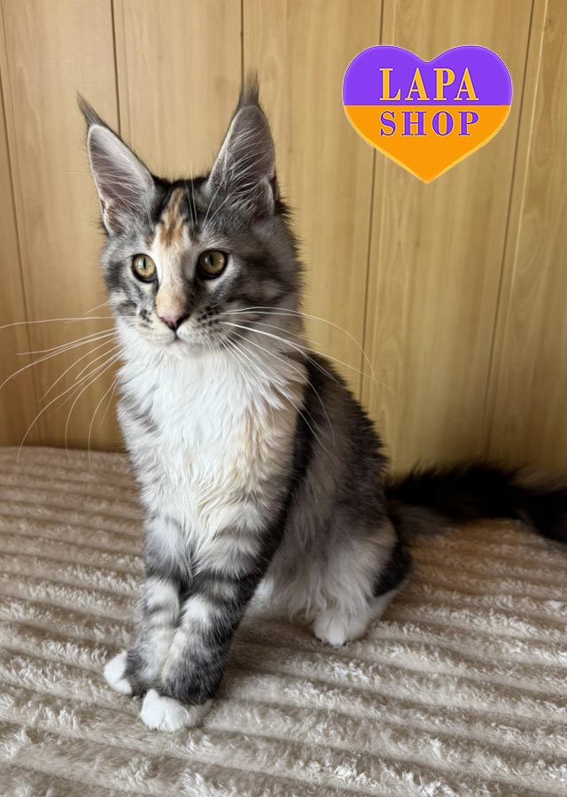 Очаровательная кошечка мейн-кун Freya имеет уникальный черепаховый серебрисый тикированный окрас с белым, что придает ее образу особую изысканность.