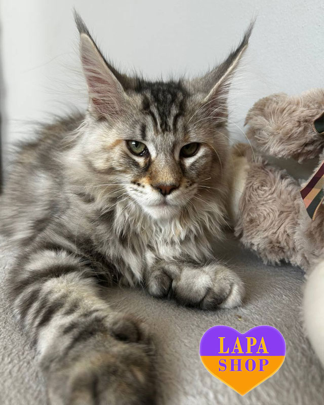 Эта красавица – настоящая уникальность среди мейн-кунов, ведь кроме роскошной черепаховой серебристой мраморной шубки, она имеет еще и полидактность – «счастливые лапки» с дополнительными пальчиками.