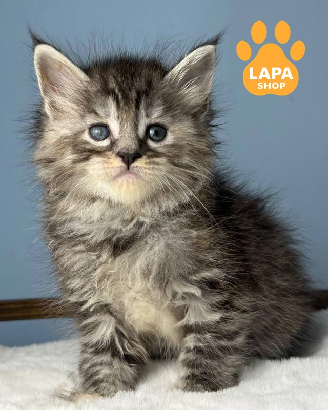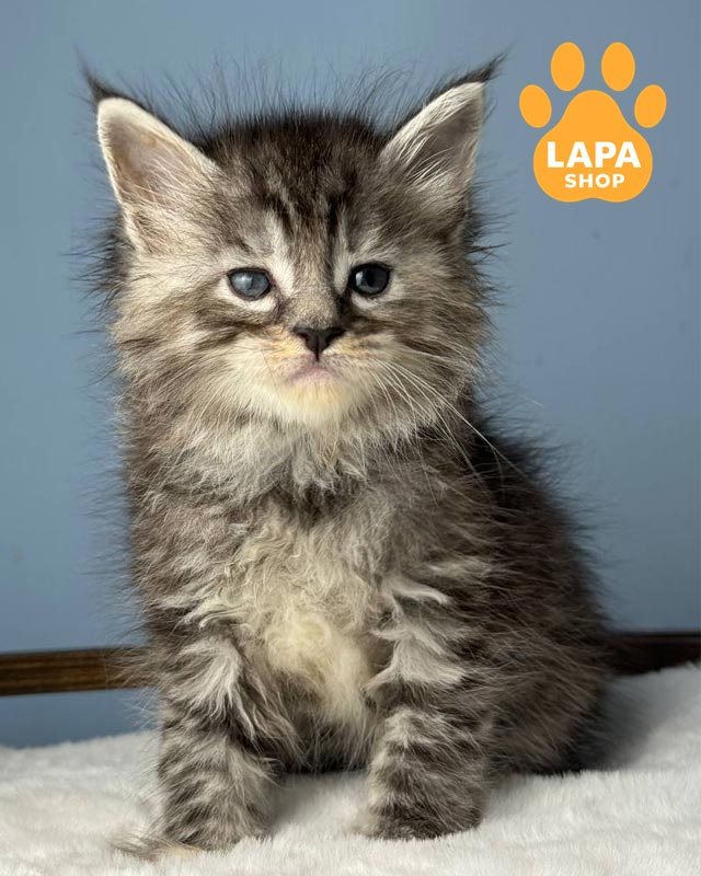 Suzana — очаровательная девочка породы мейн-кун с роскошной черной серебристой мраморной ie,rjq (ns 22), подчеркивающей ее элегантную внешность.