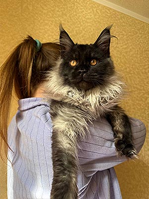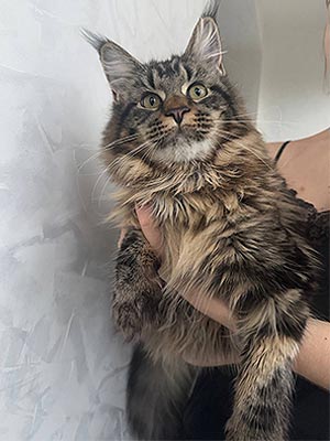 Dylan — поразительный мальчик мейн-кун с роскошным серебристым мраморным окрасом, который переливается в лучах света.