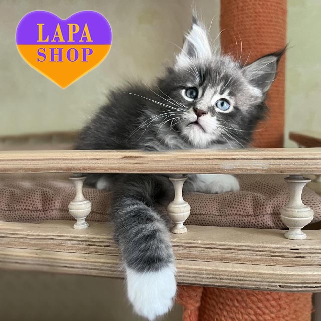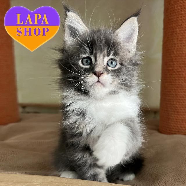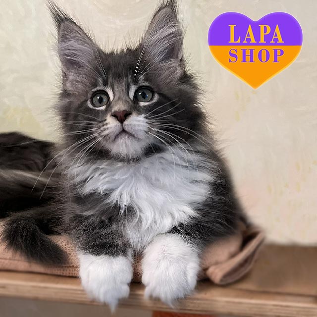 Elias – мальчик мейн-кун голубо-серебристого мраморного с белым окраса (аs 03 22). Его шерсть отличается изысканным мраморным узором, который дополнен белыми акцентами на груди, лапках и мордашке.