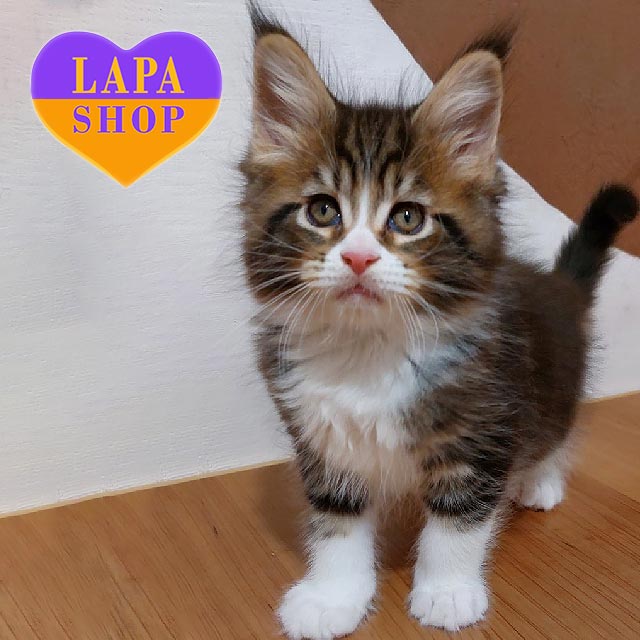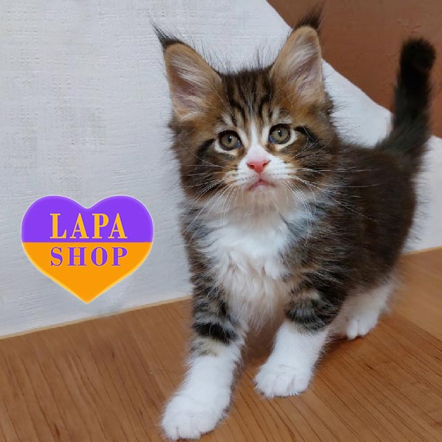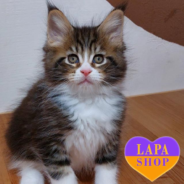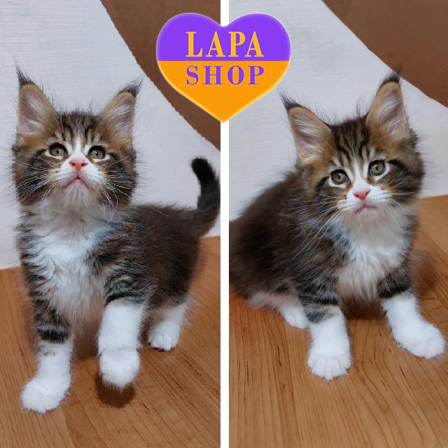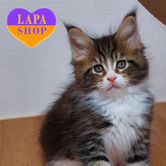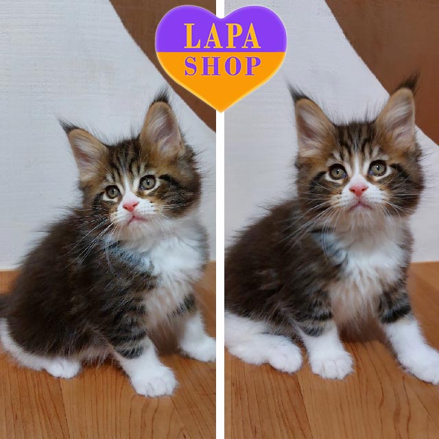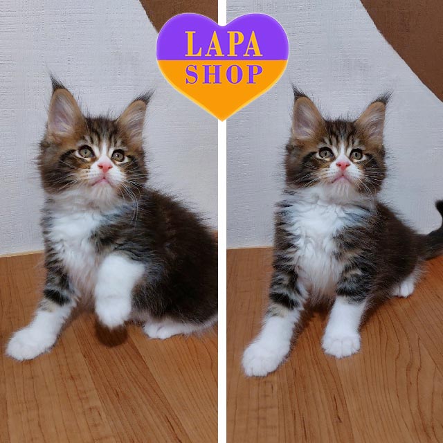 Saymon — отличный мейн-кун с роскошным черным мраморным окрасом и белыми лапками. Этот юный джентльмен привлекает внимание своим гармоничным цветовым сочетанием и утонченной внешностью.