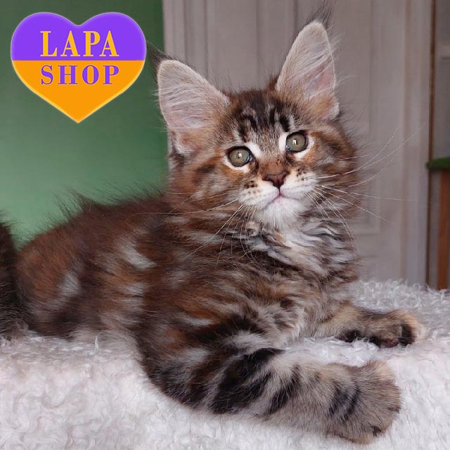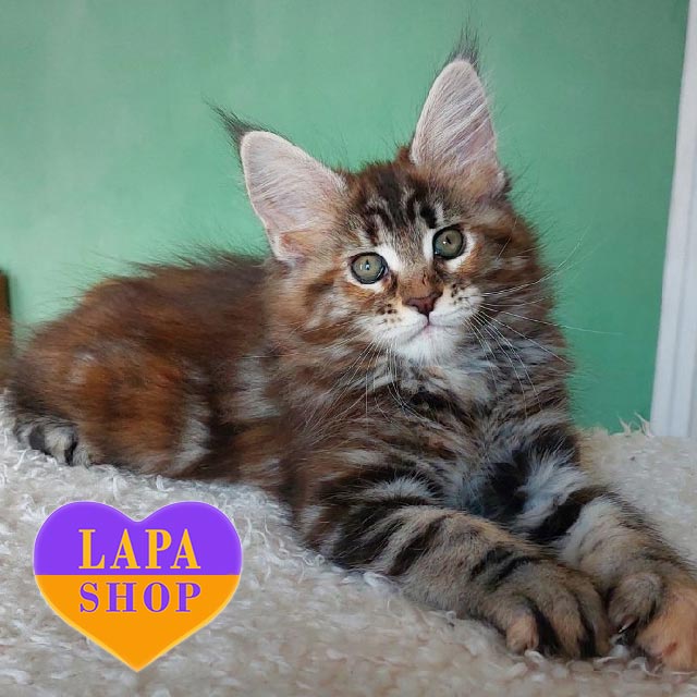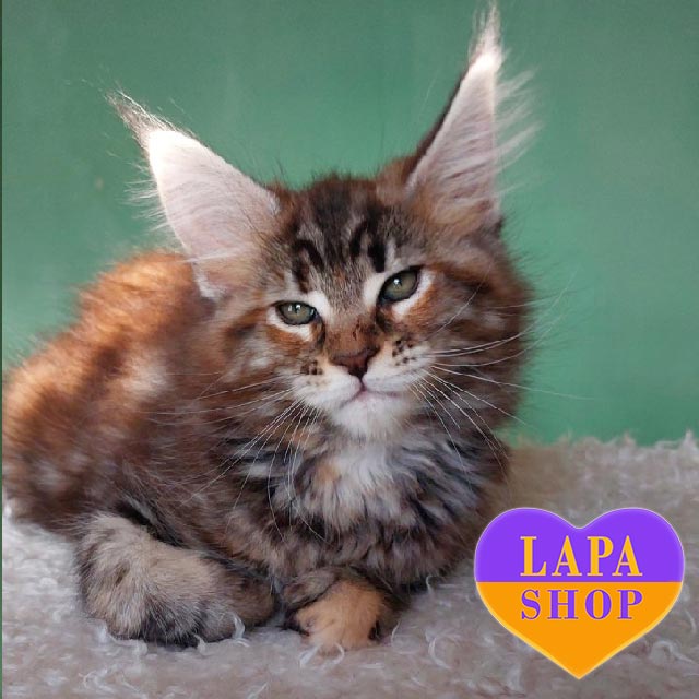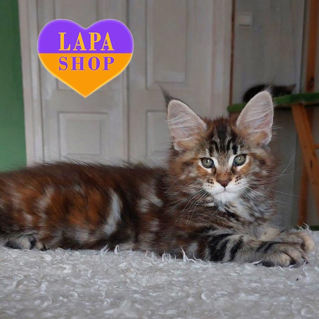 Tomiris – милый мейн-кун черепахово-мраморного окраса. Его густая, пушистая шерсть сочетает теплые и глубокие оттенки, создавая уникальный увлекающий взгляд узор.