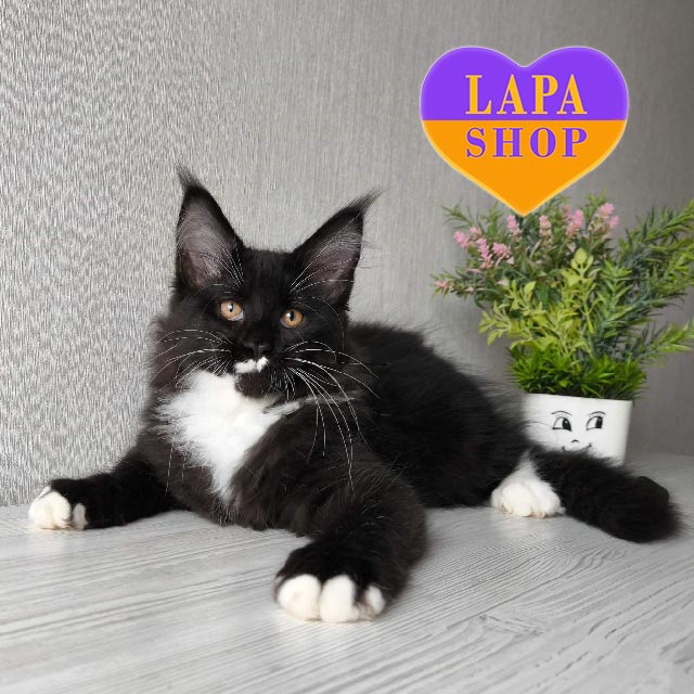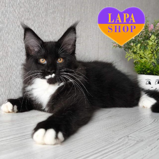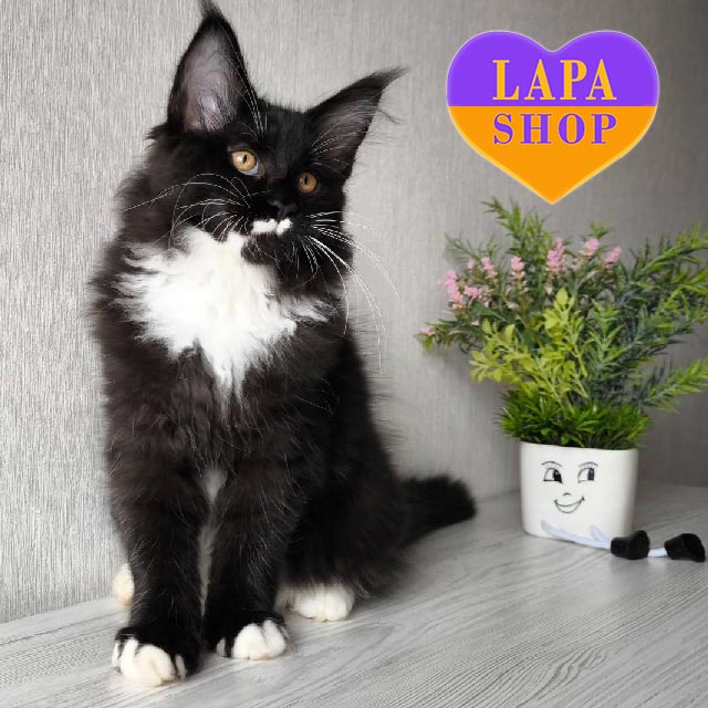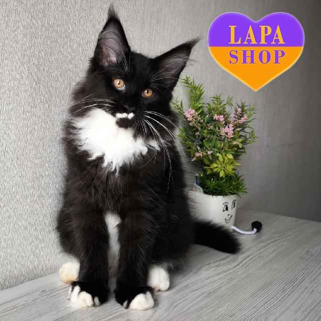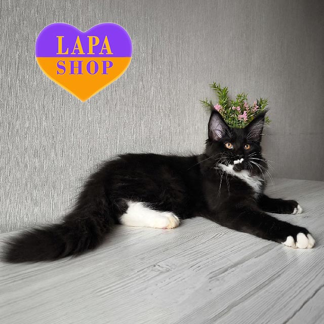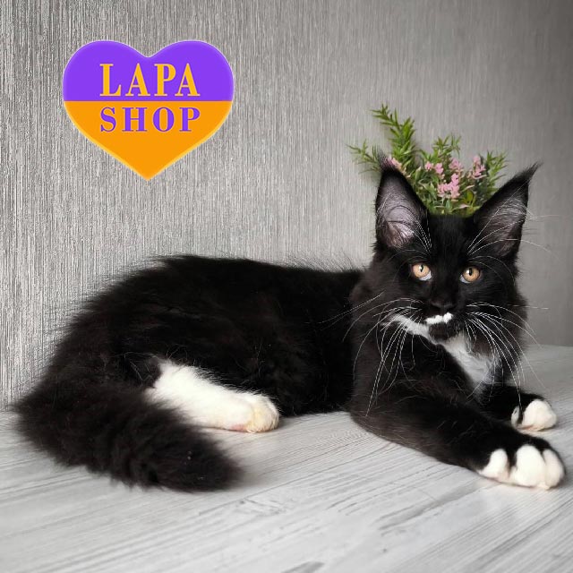 Alan – грационный мейн-кун с контрастным окрасом. Он вырастет крупным котом с густой шерстью, выразительными глазами и роскошным хвостом.