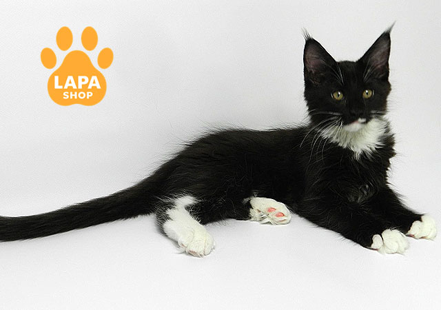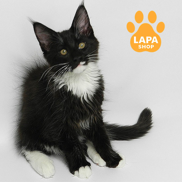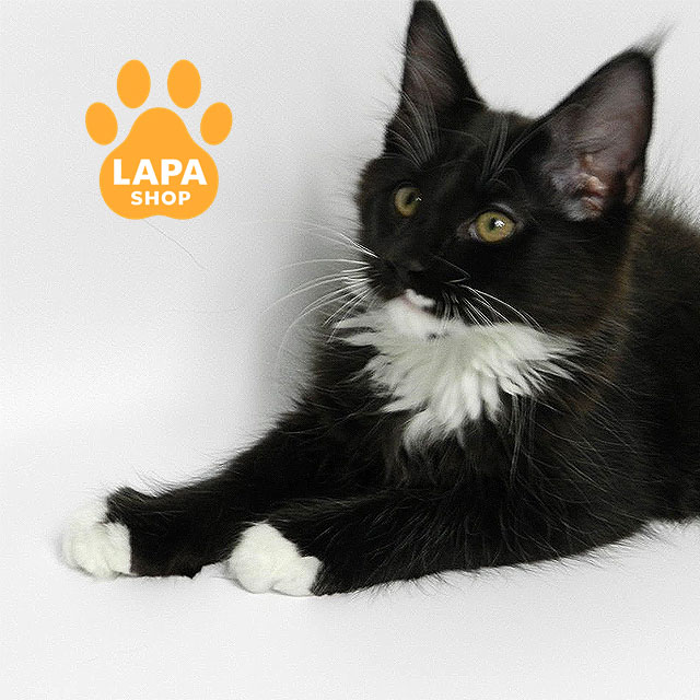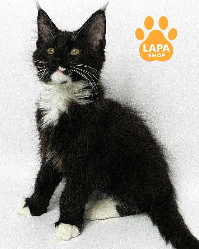 Мейн-кун Diego выглядит очень стильно благодаря контрастному сочетанию глубокого черного и белого окраса.