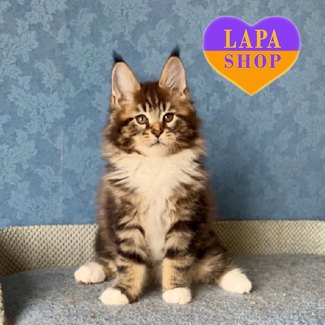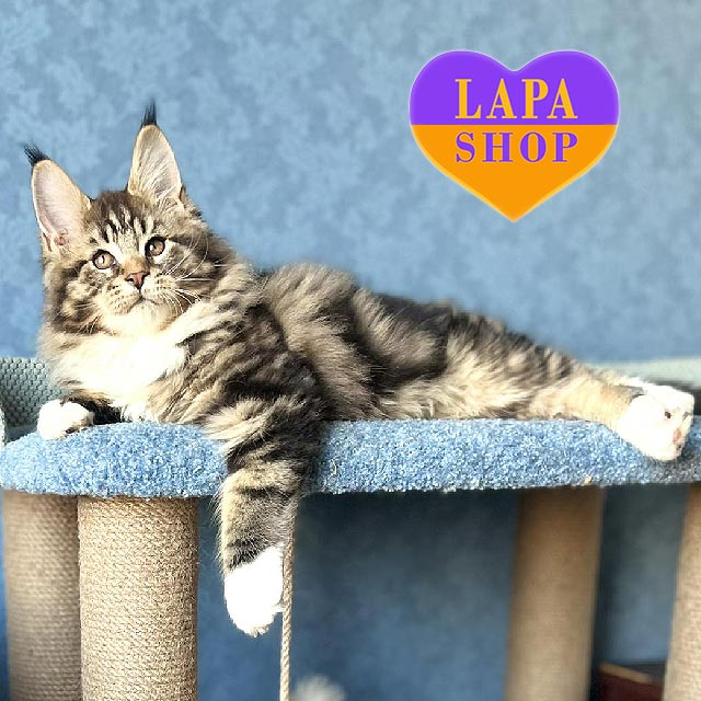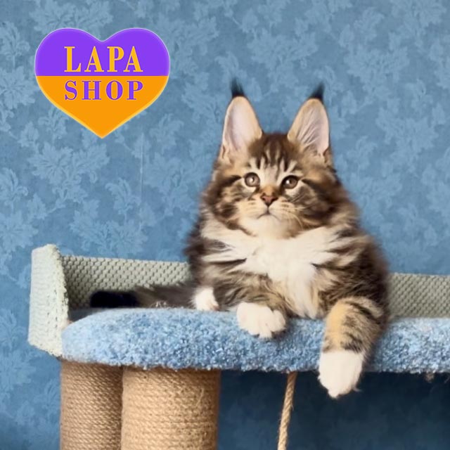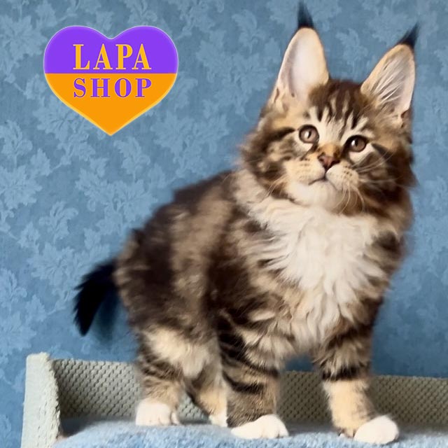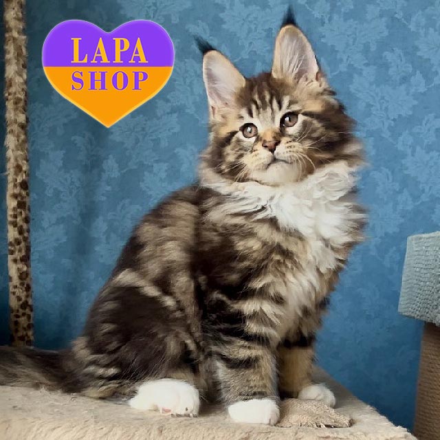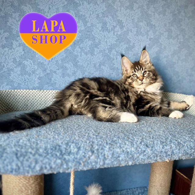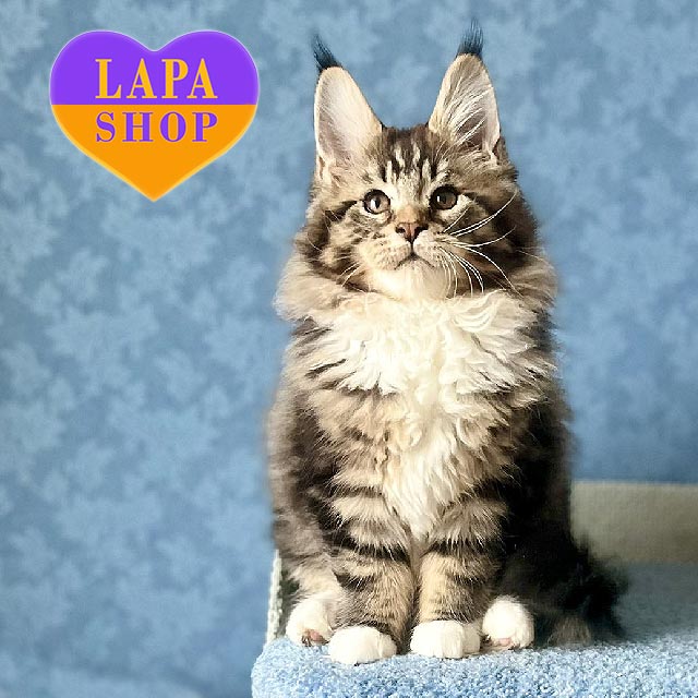 Han – крупный котенок породи мейн-кун. Его контрастный черный мраморный окрас в сочетании с белыми отметинами придает ему особый шарм.