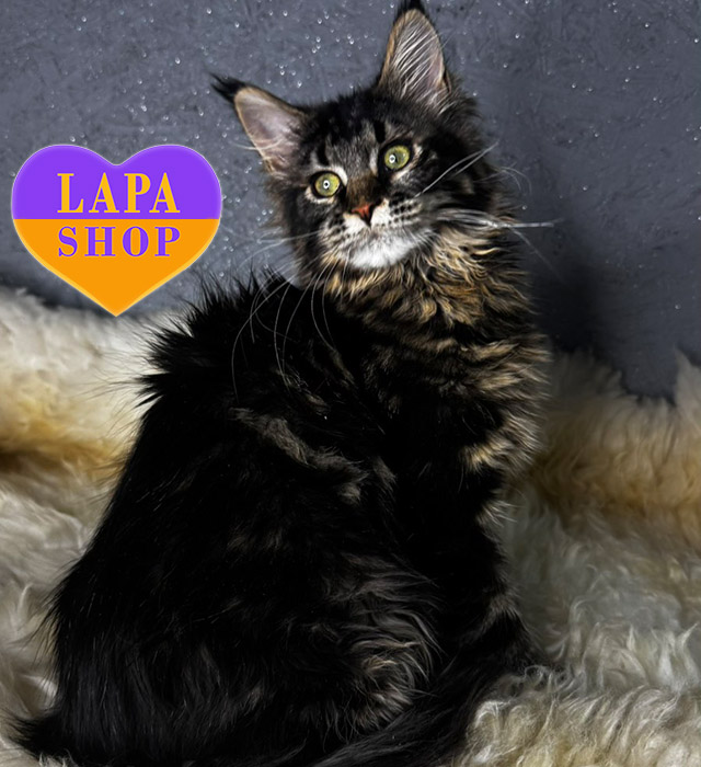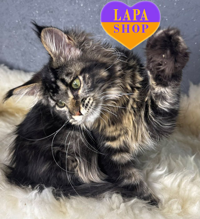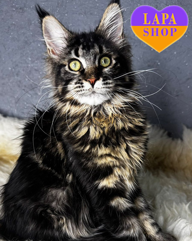 Beverly – изящная мейн-кун девочка с насыщенной черной мраморной (n 22) окраской, которая подчеркивает ее благородный вид. Ее массивная осанка и поразительный тип внешности сразу восхищают взгляд.