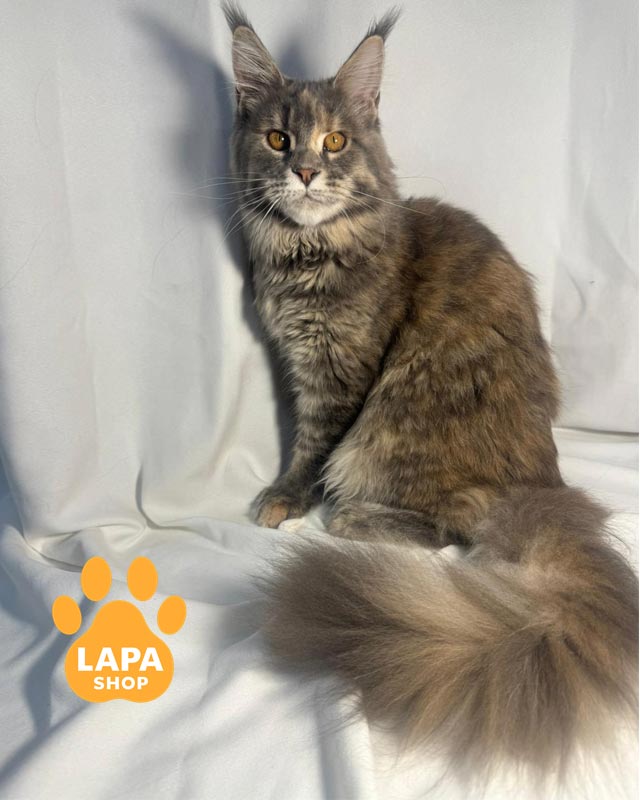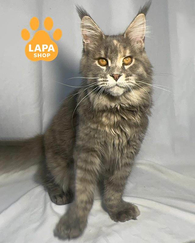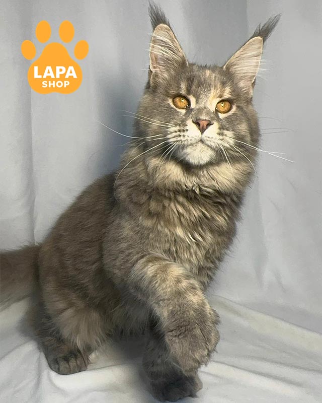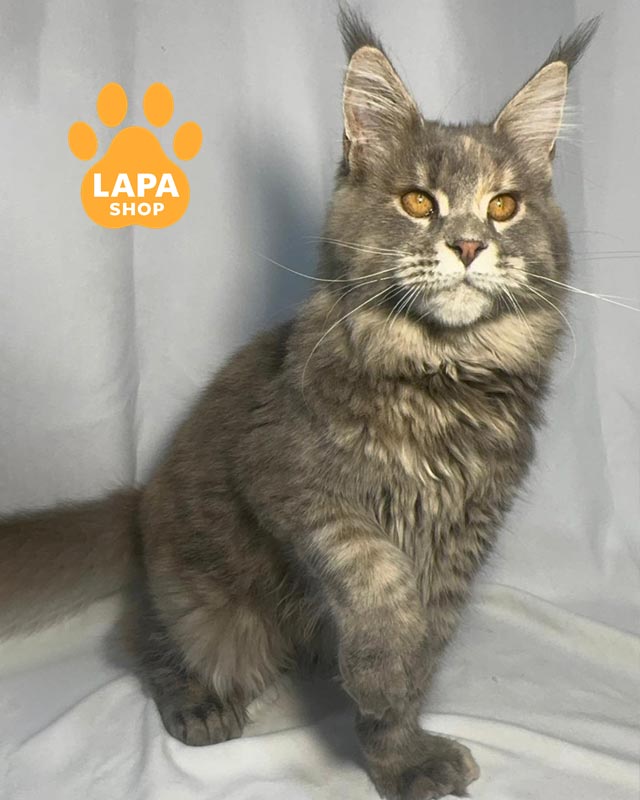 Ее окрас — голубов-кремовый черепаховый пятнистый (g 24) — сочетает нежные оттенки голубого и теплого кремового, образуя изящную игру цветов на пушистом меху.
