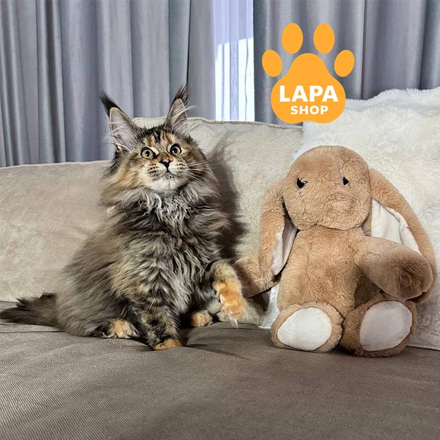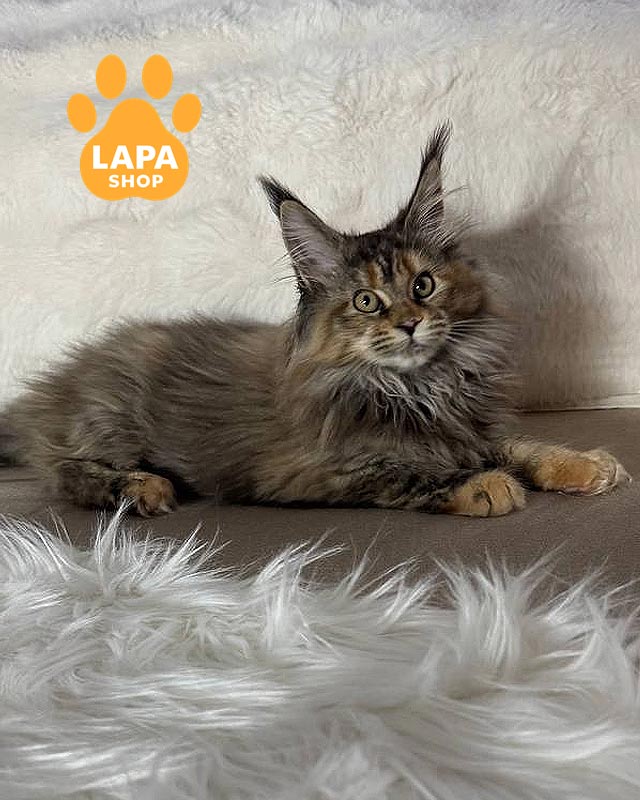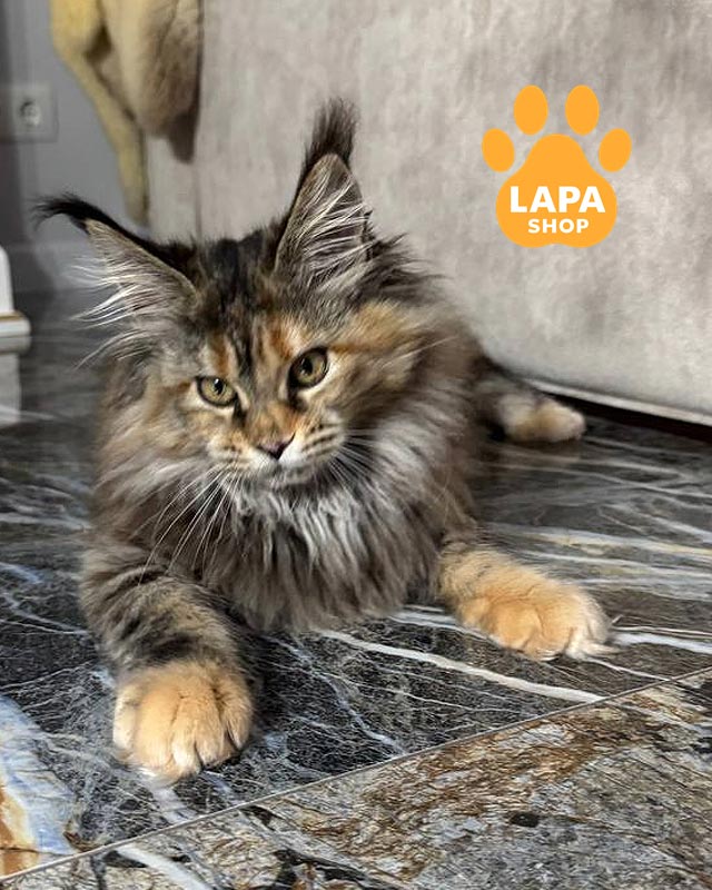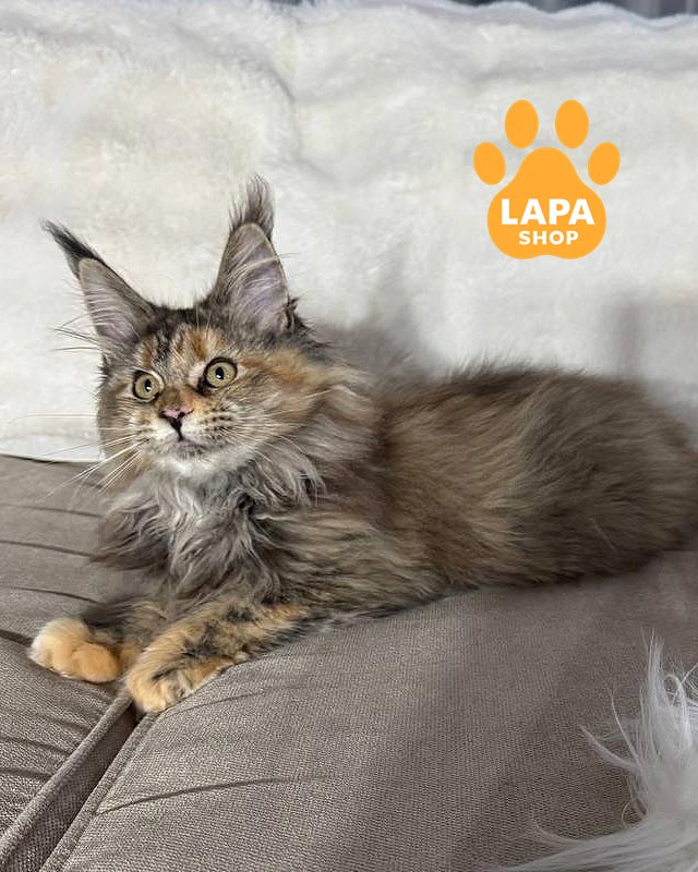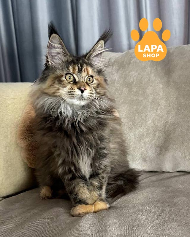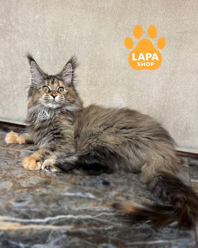 Haomi — эффектная кошечка породы мейн-кун с насыщенным черепаховым окрасом, который придает ее облику особый шарм и индивидуальность.