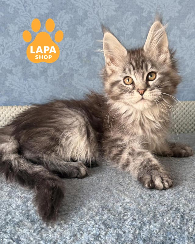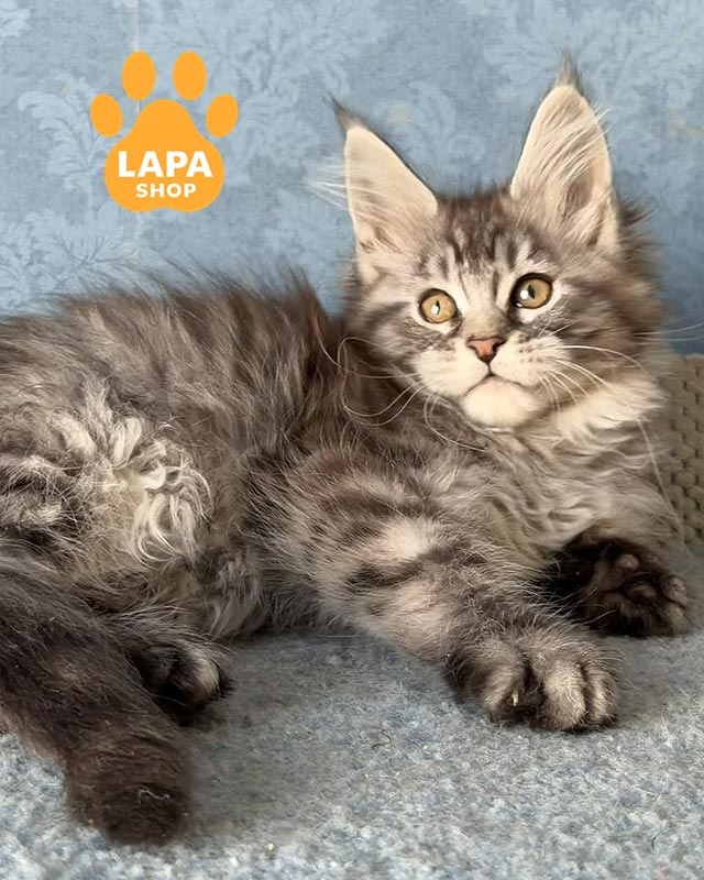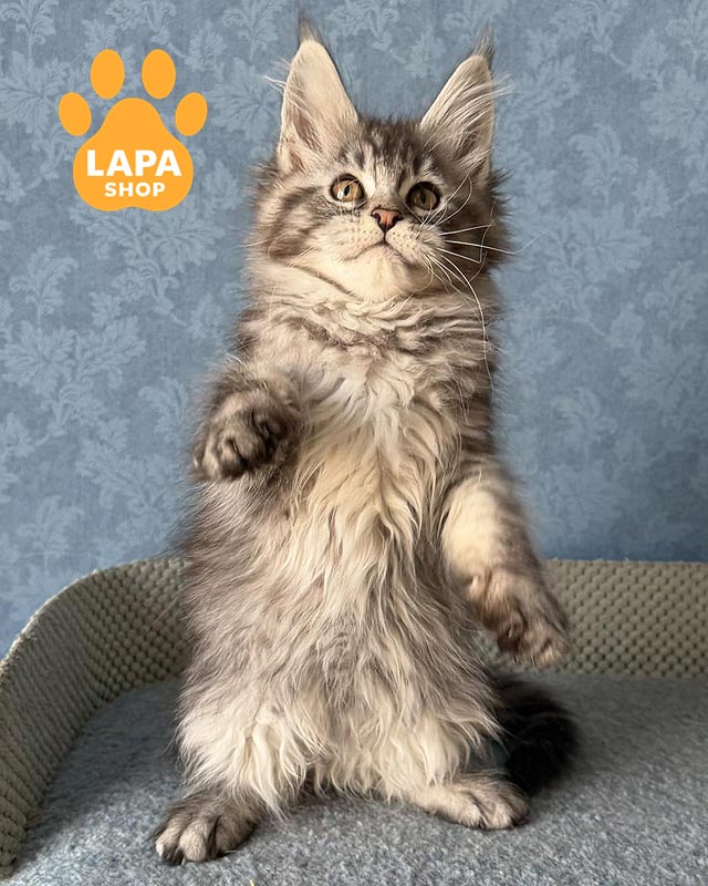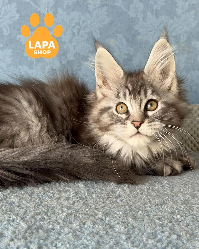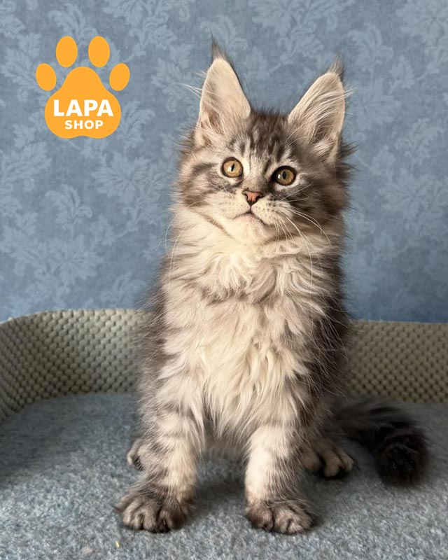 La Luna — серебристо-мраморная красавица мейн-кун с эффектной серебристой мраморной шубкой, где каждый узор шерсти сияет как лунное сияние.