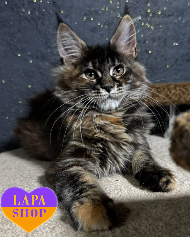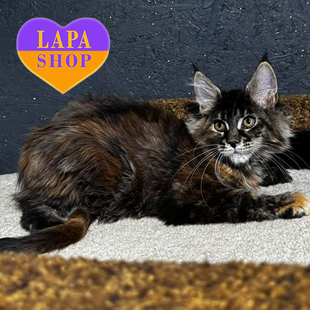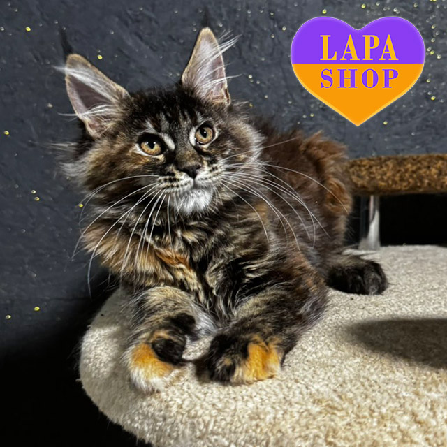 Ulyana — мейн-кун красавица с яркой черепаховой окраской (f). Ее уникальная цветовая палитра и грациозная внешность делают ее настоящей красавицей. Красавица ищет любящую семью, которая подарит ей тепло и уют.