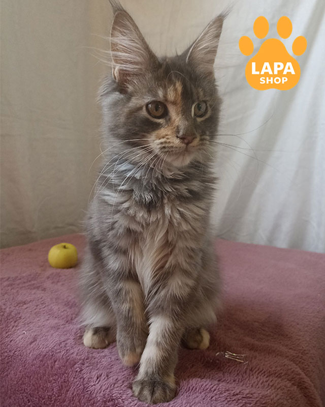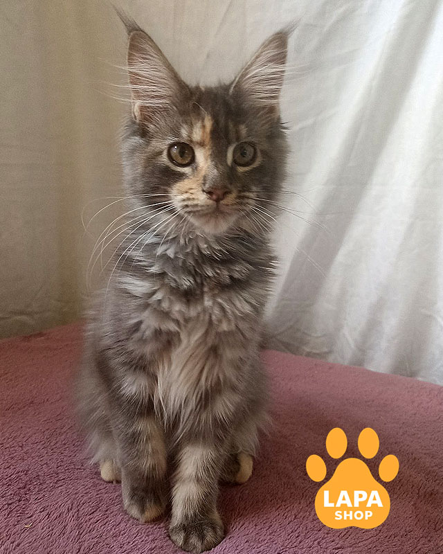 Нежная красавица породы мейн-кун Yanina. Ее редкий голубо-кремовый черепаховый серебристый окрас с пятнистым узором делает каждый вид неповторимым и очаровательным.
