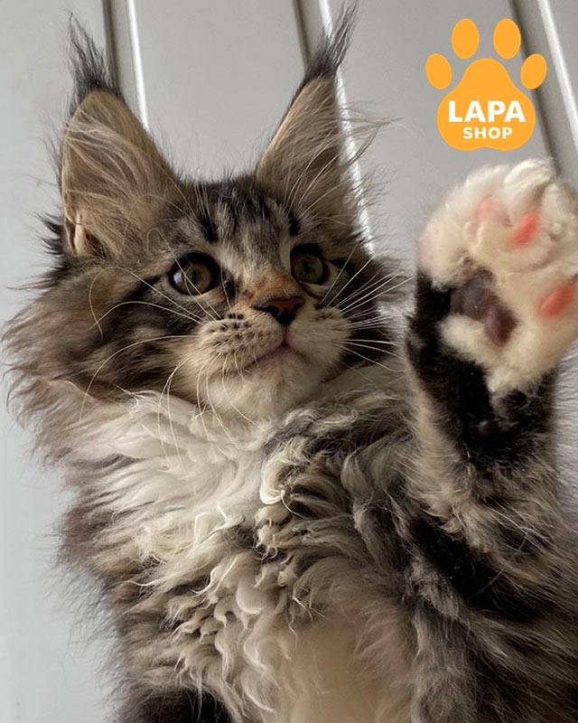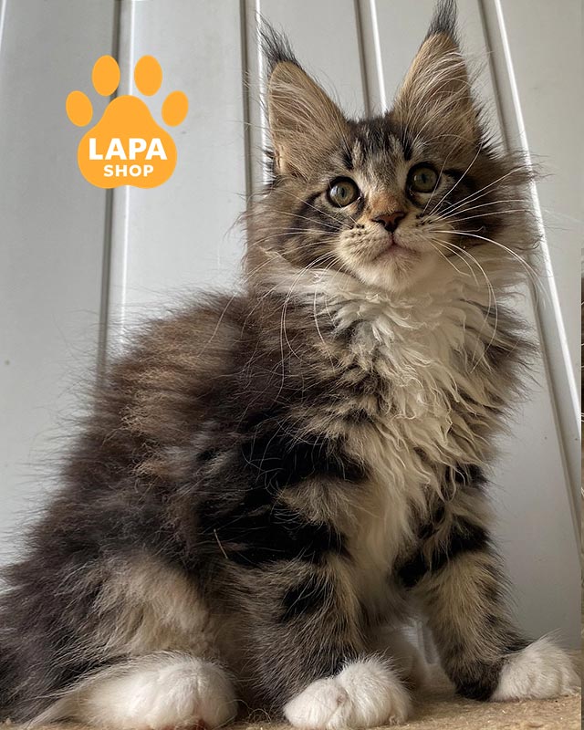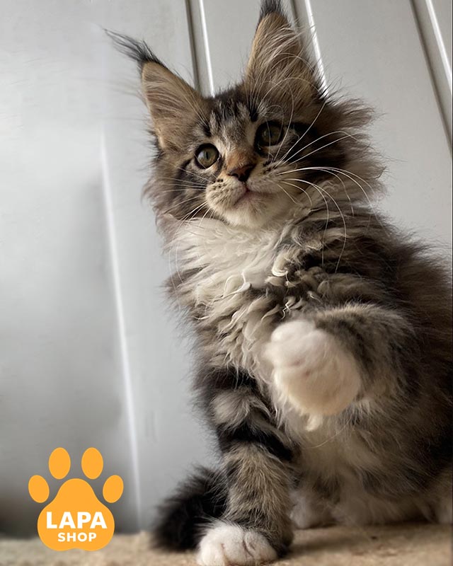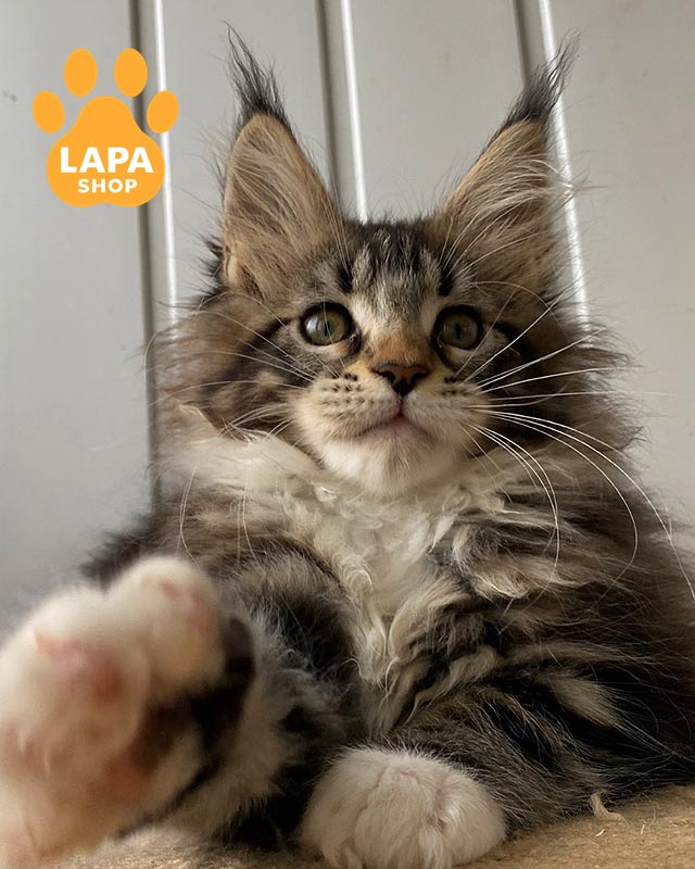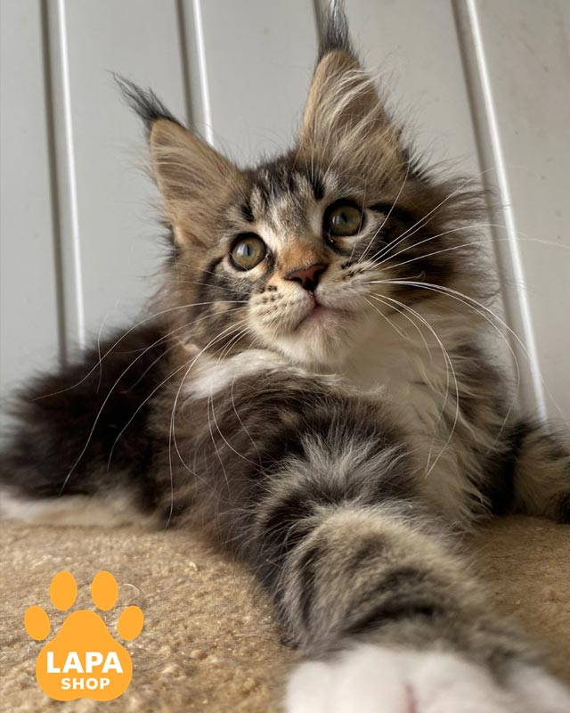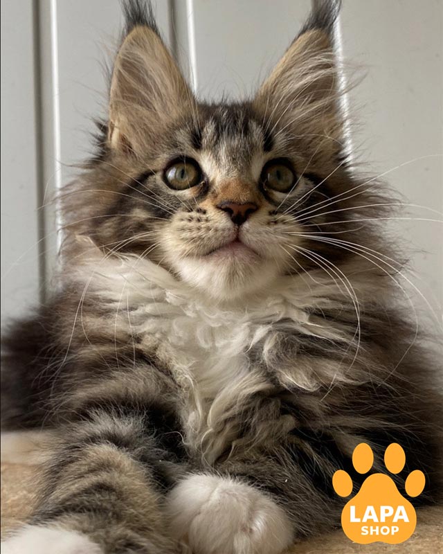 Leyla – милая девочка породы мейн-кун с контрастным черным мраморным рисунком, придающий ей изысканный аристократический вид.
