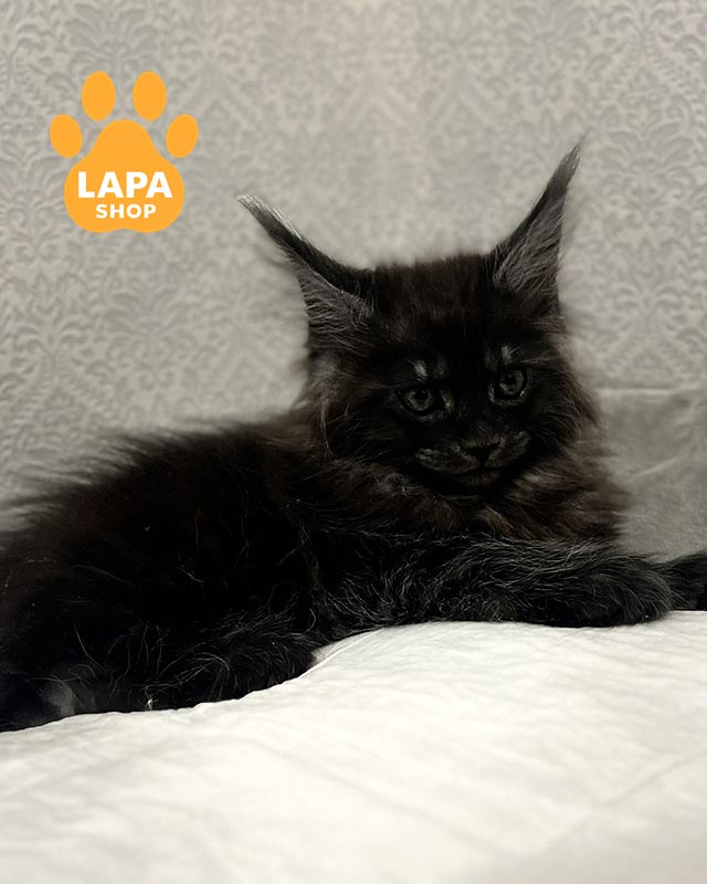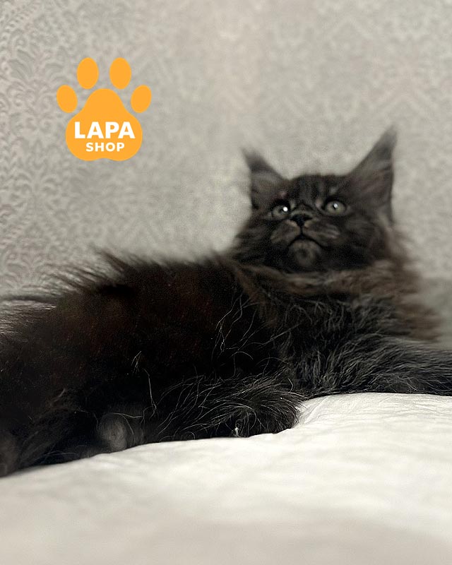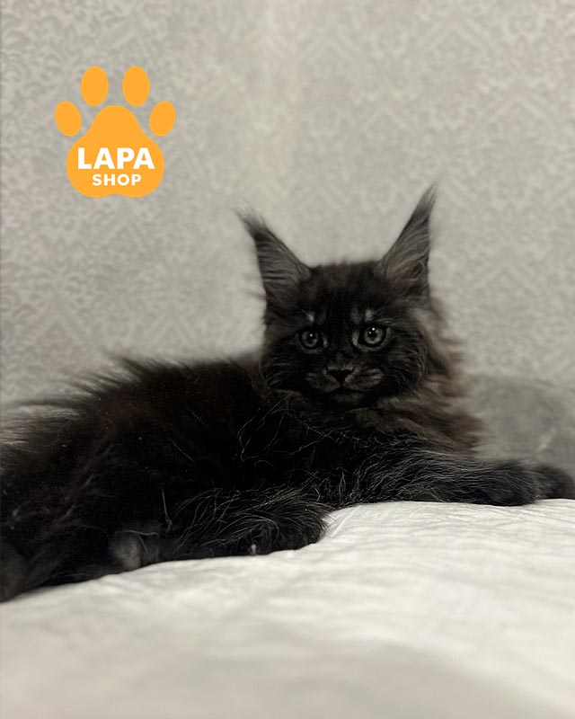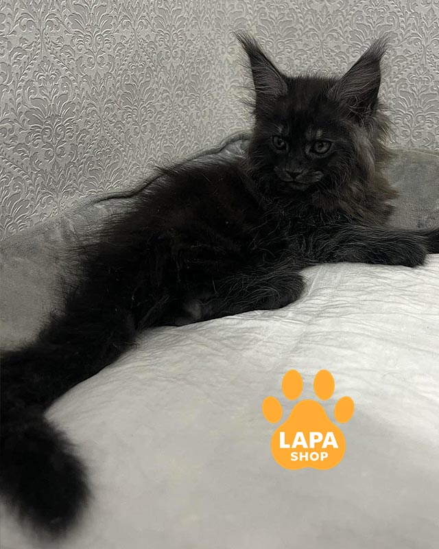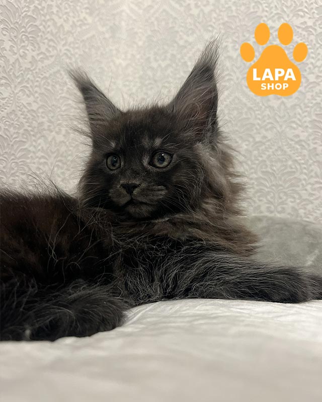 Котенок породы мейн-кун имеет насыщенный черный дымный окрас, в которой темный верх шерсти сочетается со светлым основанием, создавая красивый дымчатый эффект в движении.