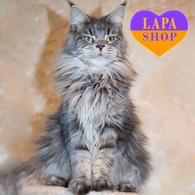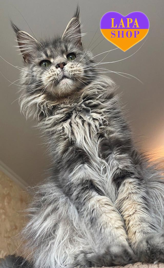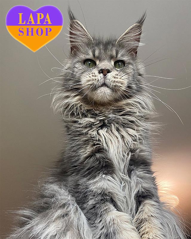 Mila — очаровательная представительница породы мейн-кун с благородным голубо-мраморным окрасом (a 22), который мягко переливается на ее густой шерсти.