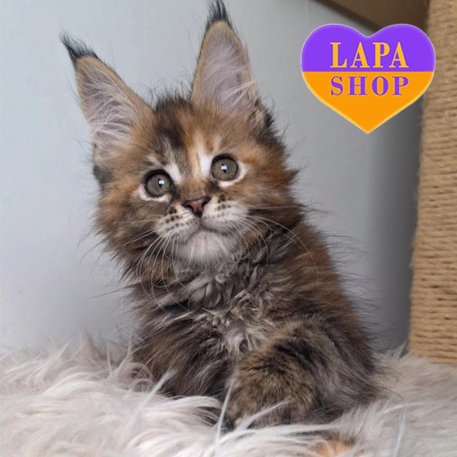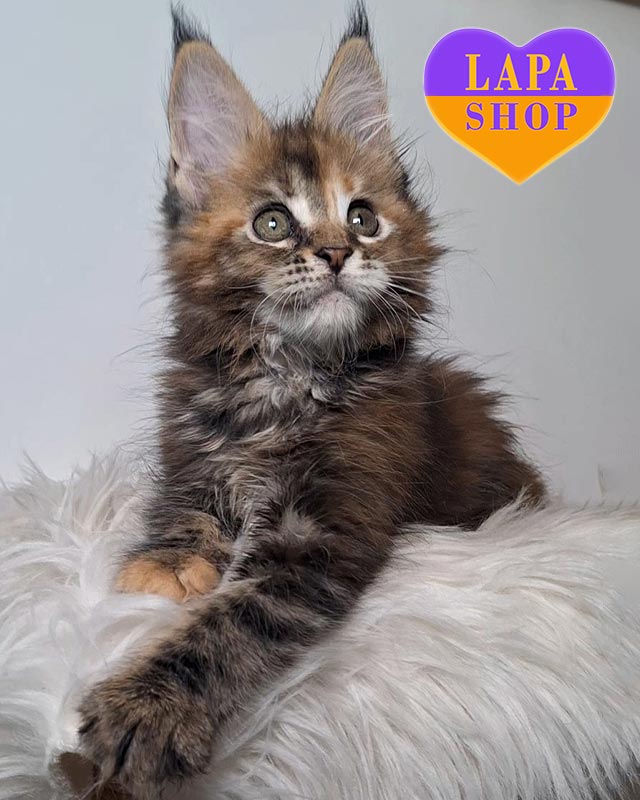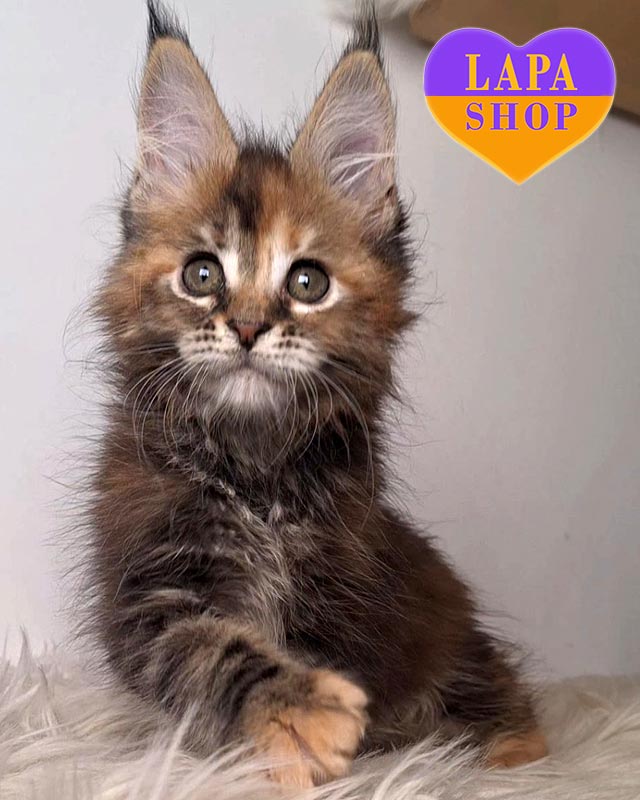 Milana — настоящая кошачья королева с роскошным черепаховым мраморным окрасом (f 22), который делает каждое ее пятнышко уникальным. Она имеет пушистую шерсть, мощное телосложение и грациозные черты настоящего мейн-куна.