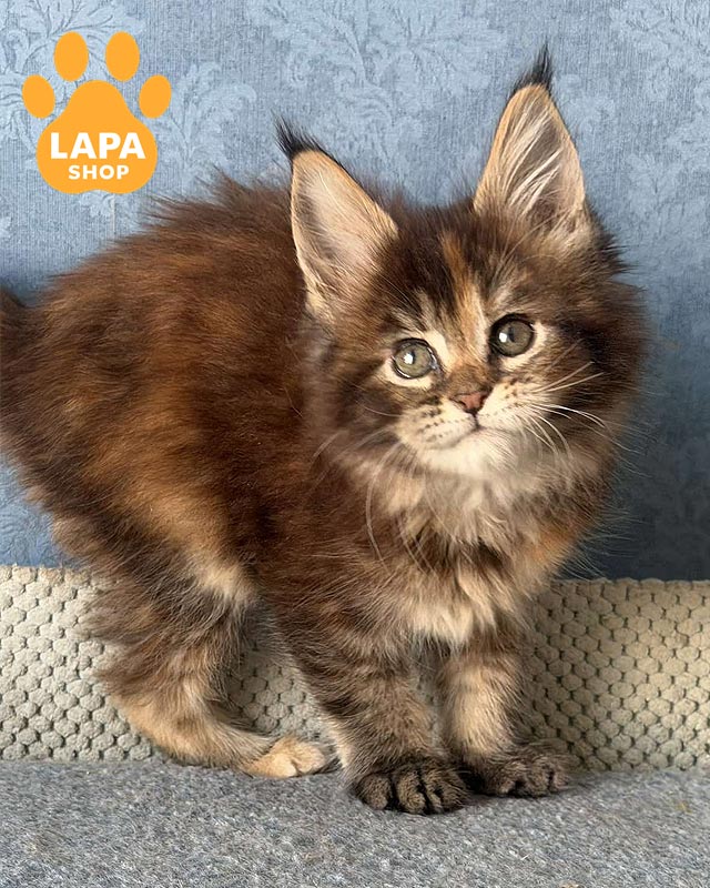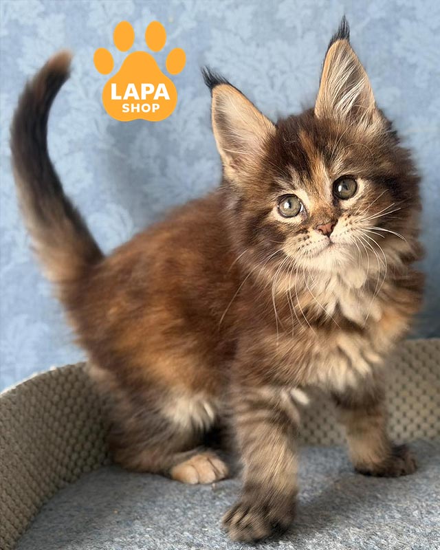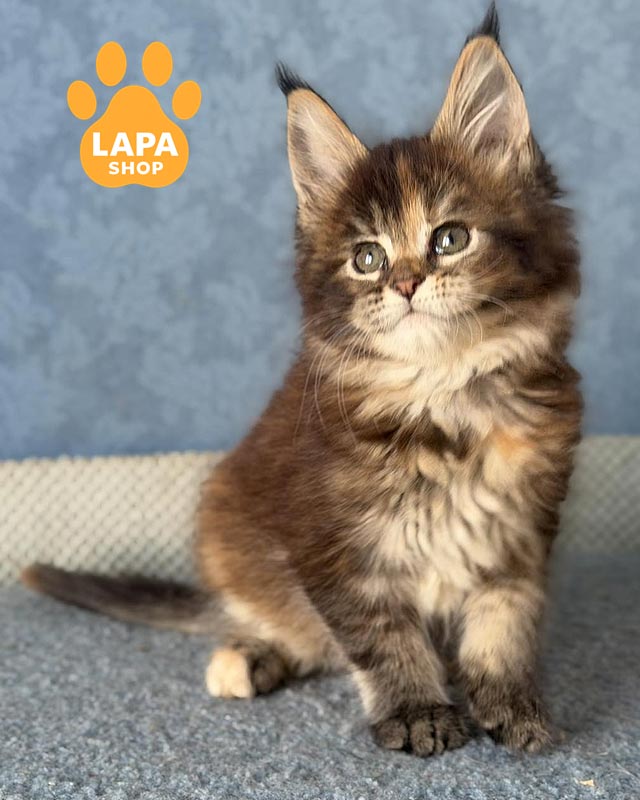 Она поражает своей черепаховым тикированным окрасом (f 25), где каждый оттенок гармонично переплетается, создавая живой и нежный рисунок на ее роскошной шерсти.