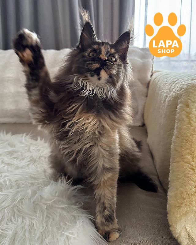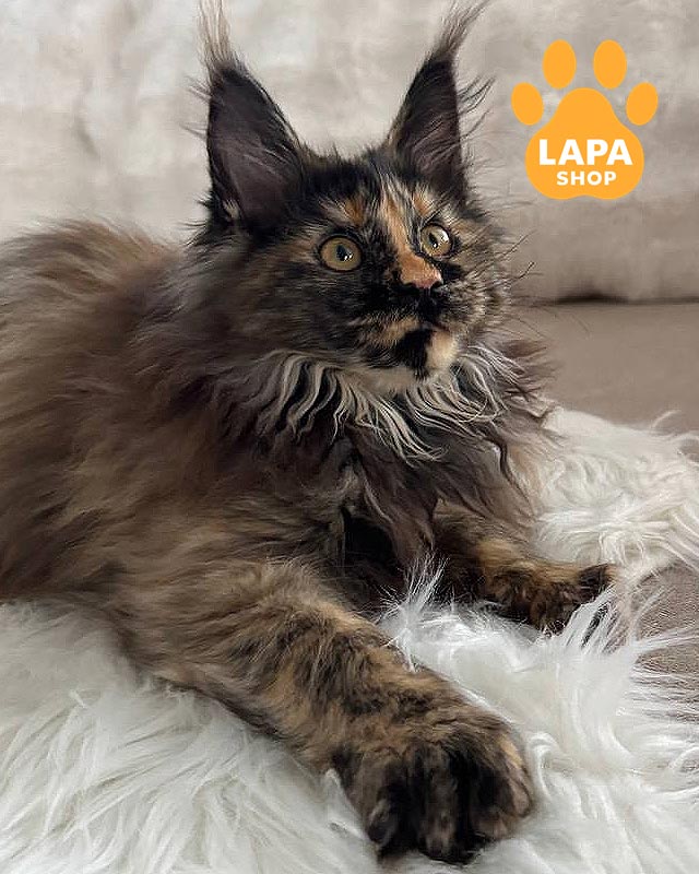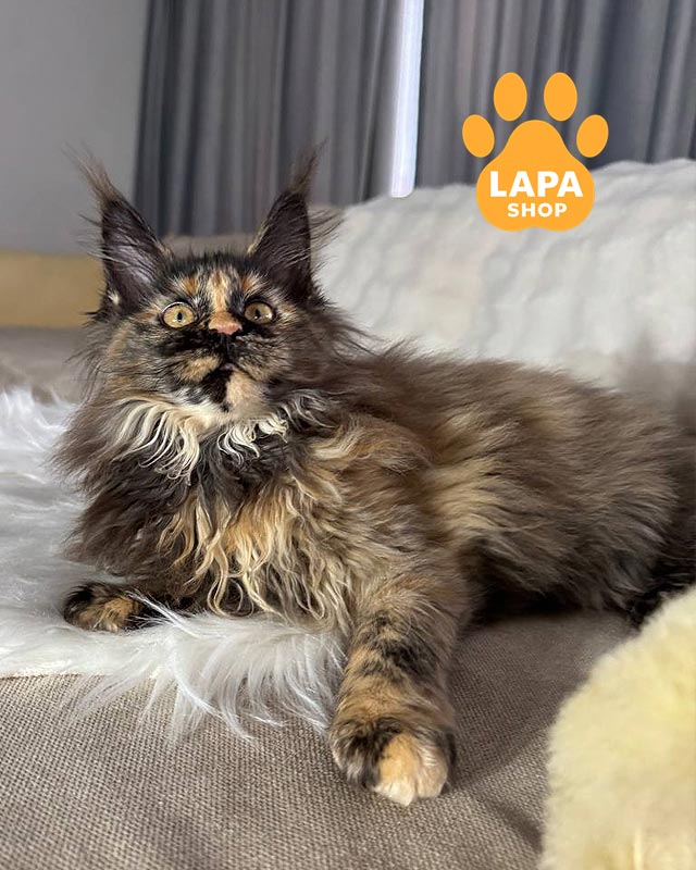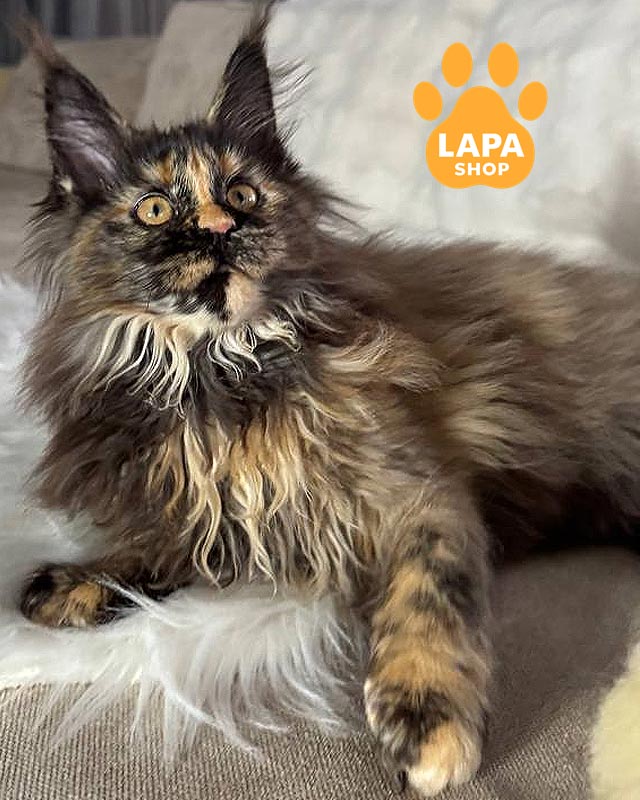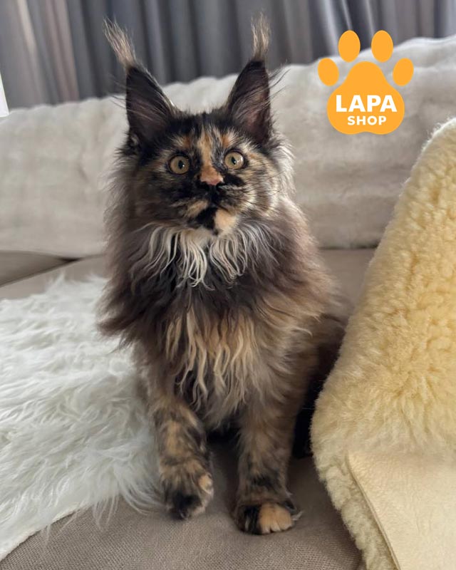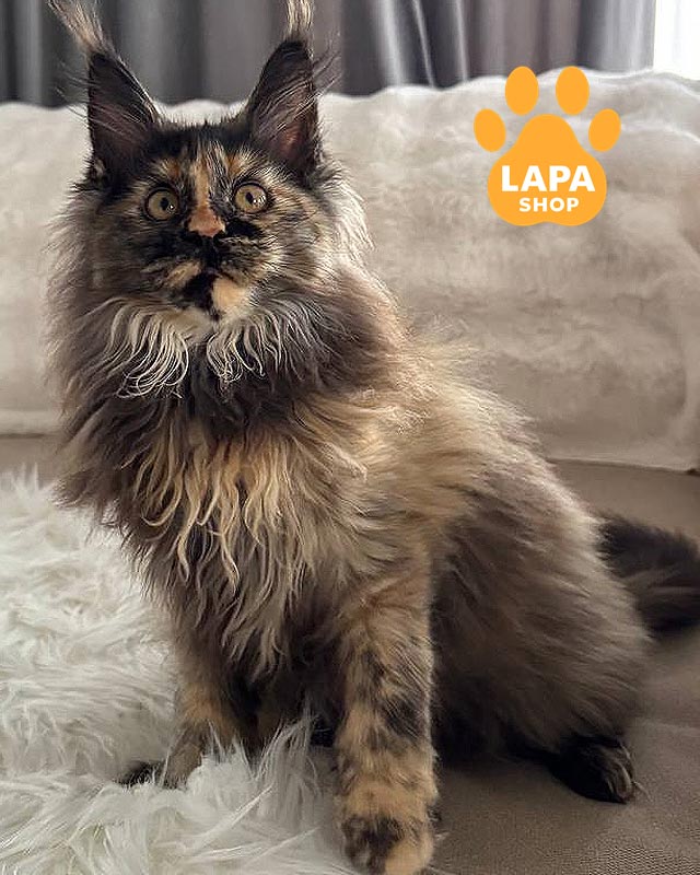 Nicky — роскошная кошечка породы мейн-кун с насыщенным черепаховым окрасом, который делает ее образ ярким и неповторимым.