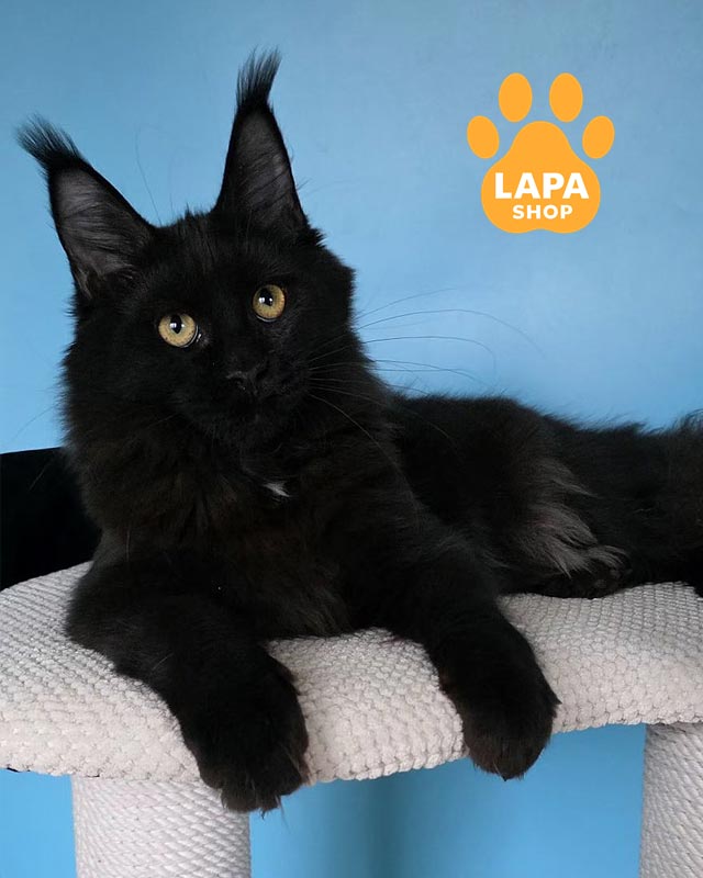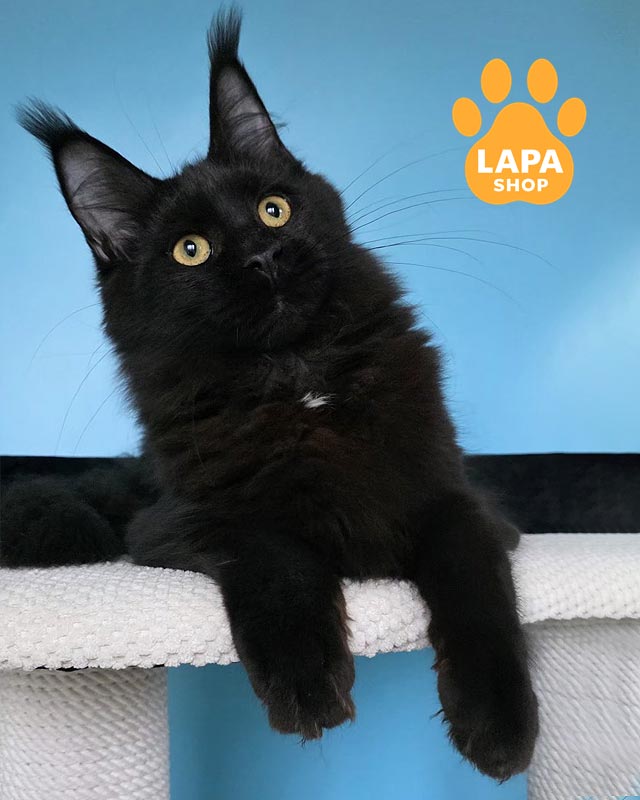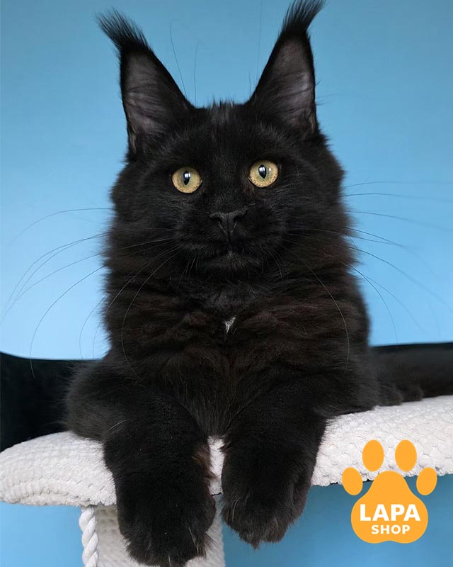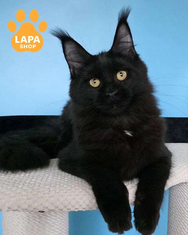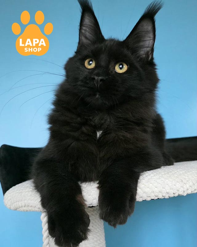 Очаровательная мейн-кун девочка Nola – грациозная дама с густой шелковистой шерстью насыщенного черного окраса, украшенной нежным белым медальоном.