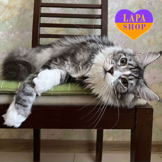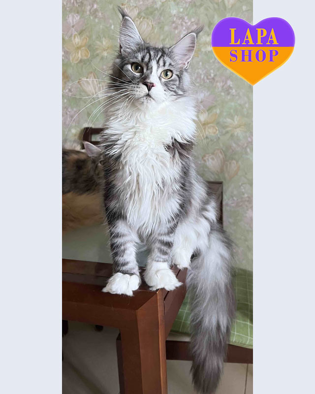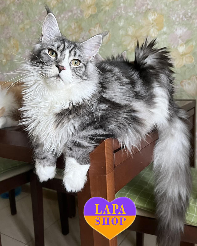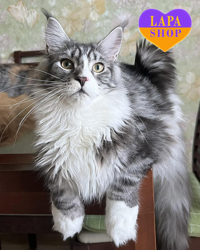 Franek — грациознный мейн-кун с выразительным черным серебристым биколор мраморным (ns 03 22) окрасом.