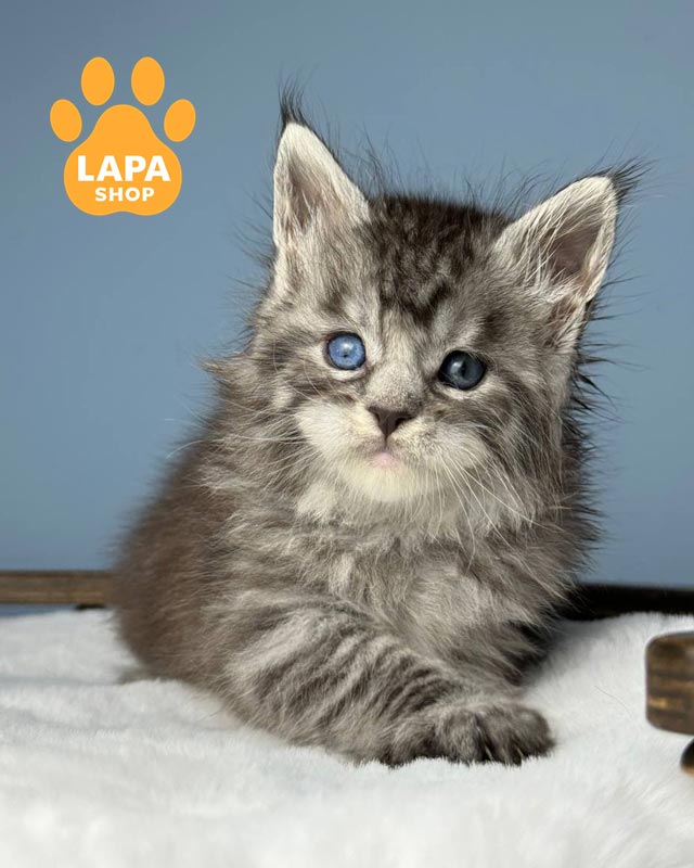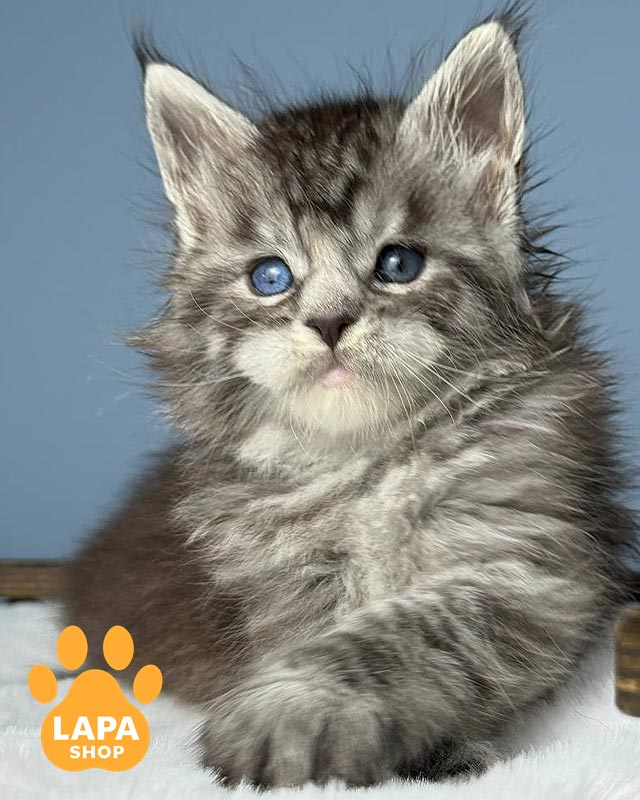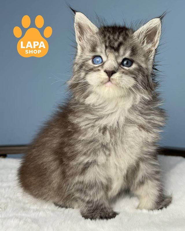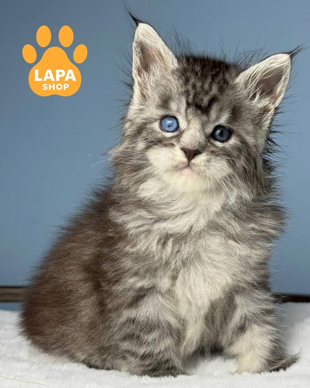 Romeo — эффектный мальчик породы мейн-кун с глубокой серебристой пятнистой шубкой (ns 24), которая делает его особенно выразительным.