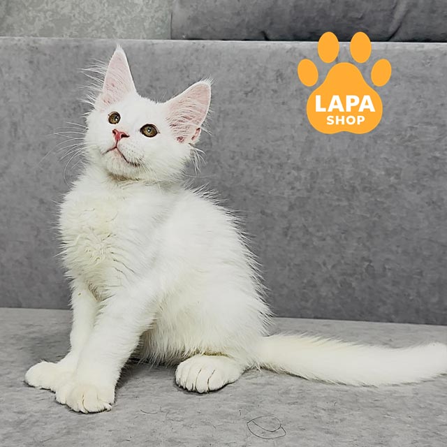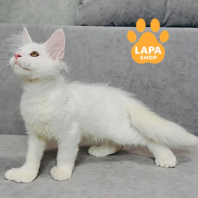 Его снежно-белая шубка сияет чистотой и нежностью, подчеркивая благородную внешность. Он имеет гармоничное телосложение, пушистый хвост и большие лапки с дополнительными пальчиками, которые придают ему особый шарм.