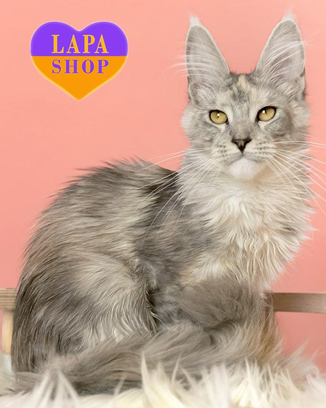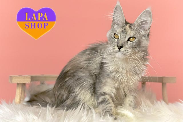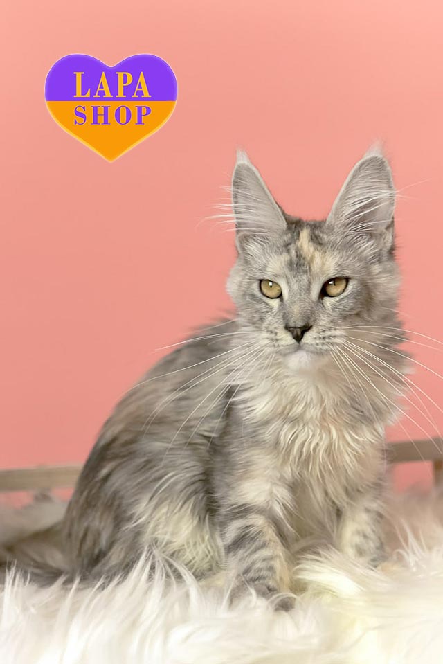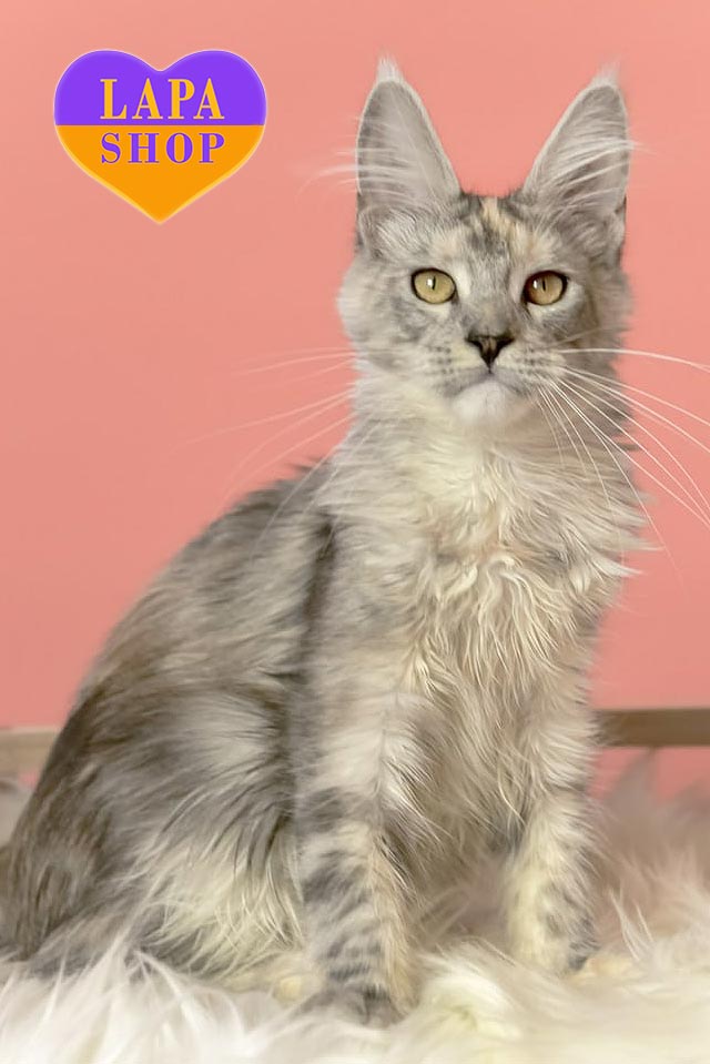Serenada — очаровательная мейн-кунка с роскошным черепахово-серебристым мраморным окрасом(fs 22), сочетающий загадочность и утонченную красоту.