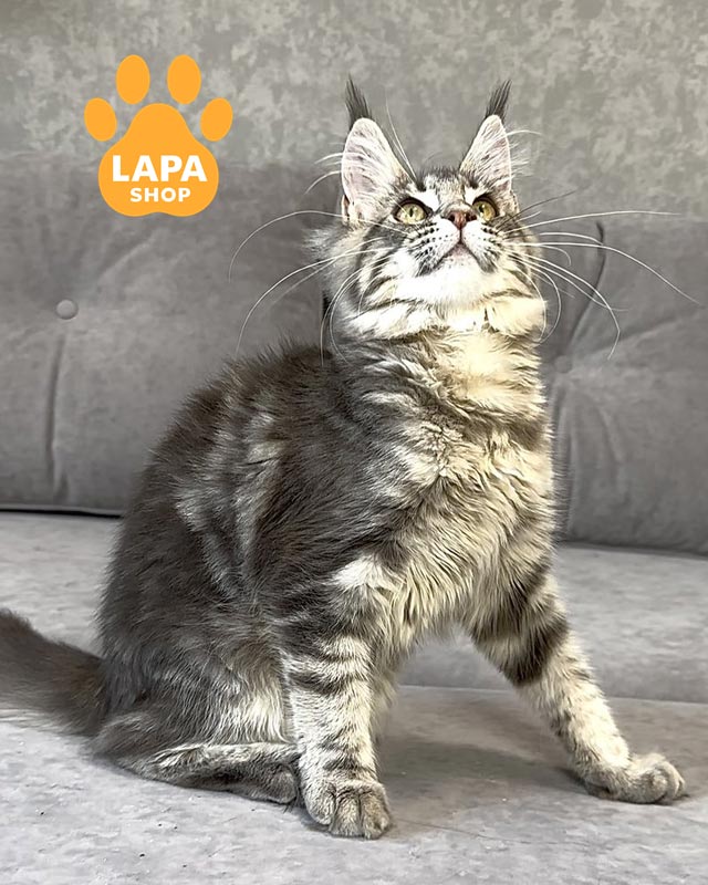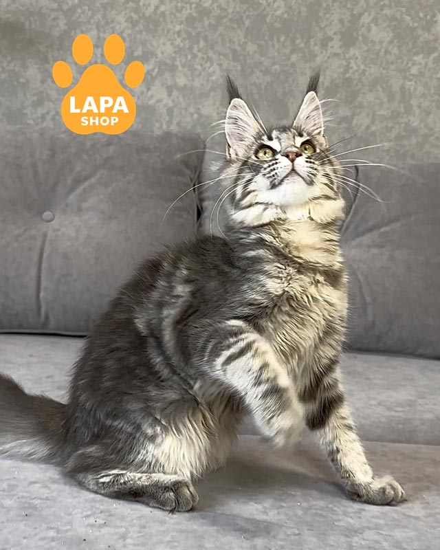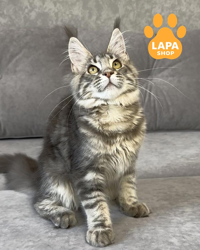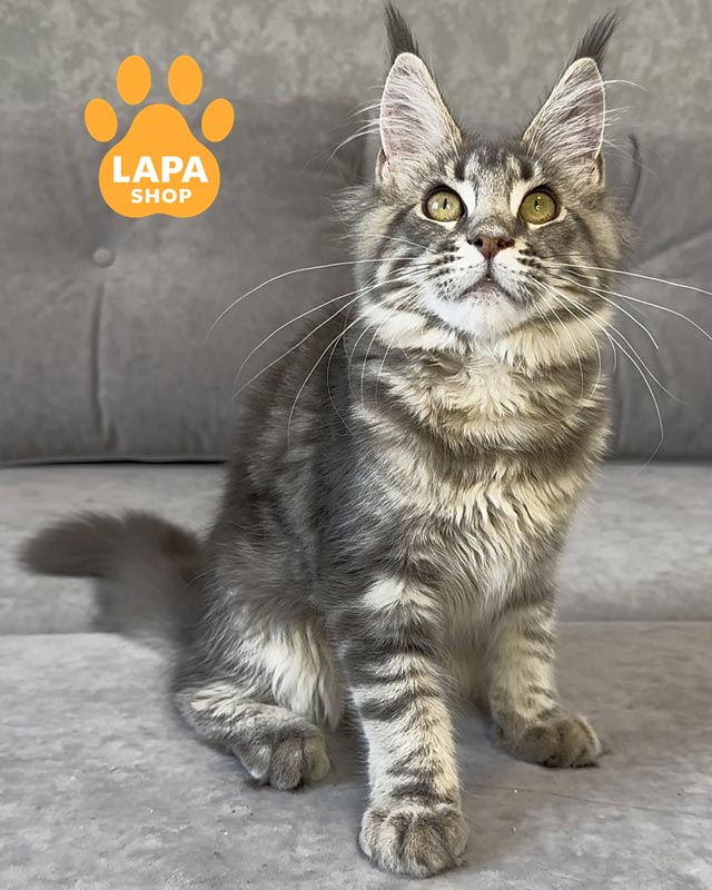 Shakira – маленькая леди мейн-кун с выразительным мраморным окрасом в голубых и серебристых тонах.
