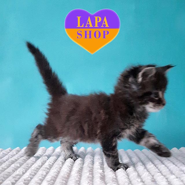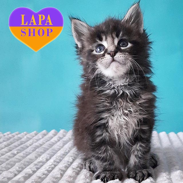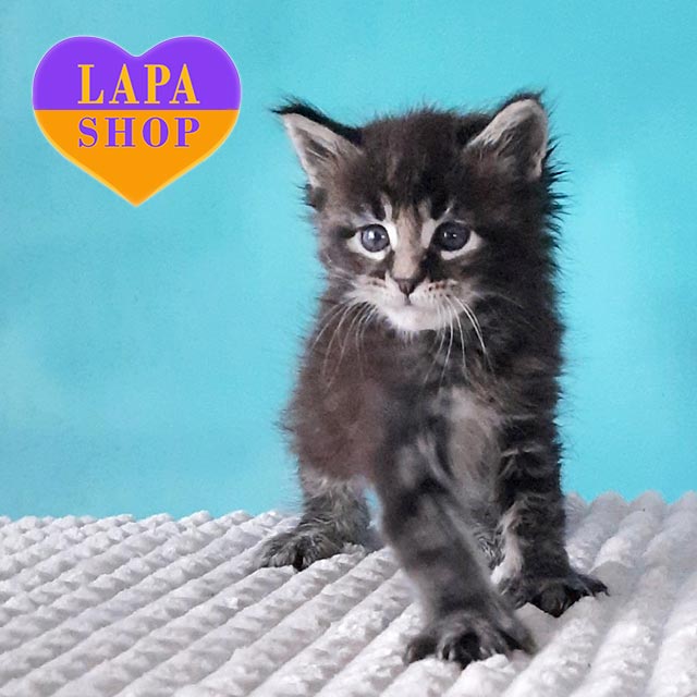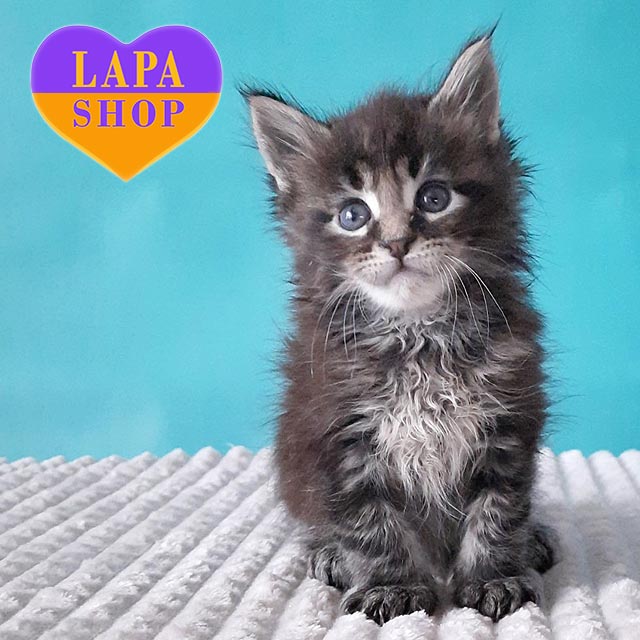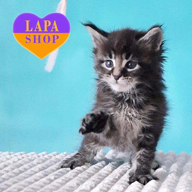 Сильвестр – роскошный мейн-кун в черном табби окрасе (n 22), настоящий миниатюрный хищник с выразительным взглядом.
