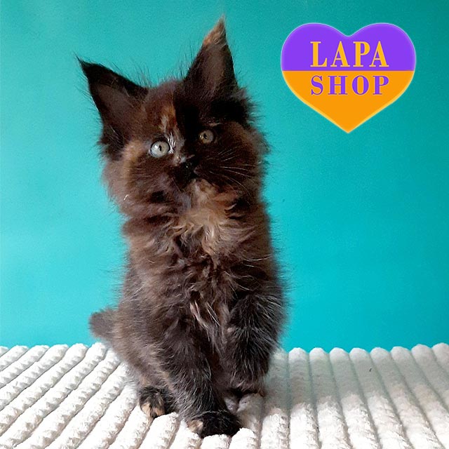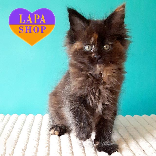 Tango – очаровательная девочка породы мейн-кун. Ее роскошная черная черепаховая шубка блестит в лучах солнца, а взгляд полон мудрости и игривости одновременно.