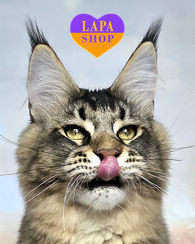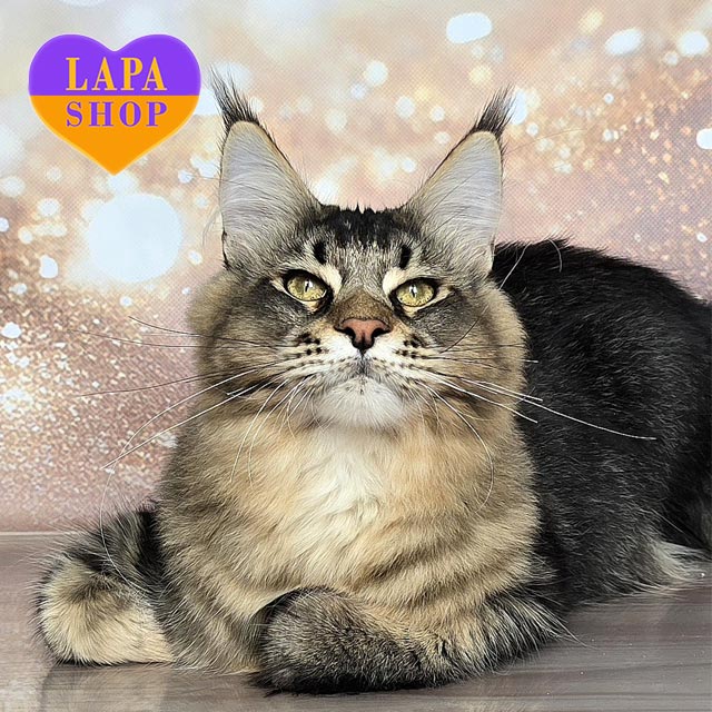 Знакомьтесь — Тор, котёнок мейн-куна с редким черным тикированным окрасом, словно тень, ожившая среди солнечных бликов.