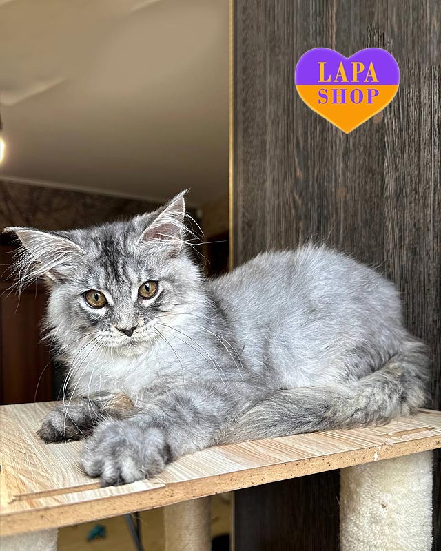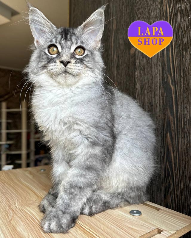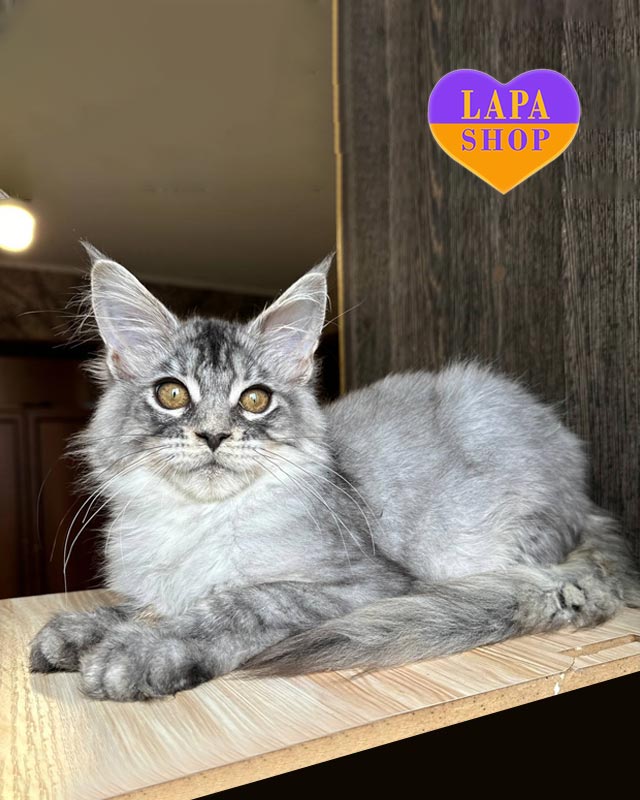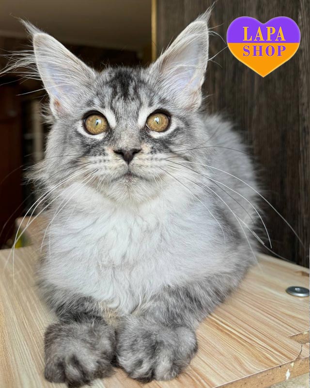 Цезарь — изысканный мейн-кун мальчик с серебристым тикированным окрасом, который создает эффект мягкой тени — настоящий «shaded line».