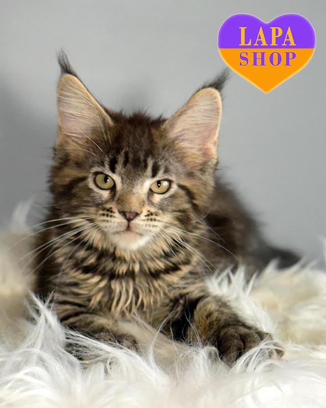 Ugo — харизматичный мейн-кун с глубоким черным мраморным окрасом, который создает на его шубке эффект изысканного узора.