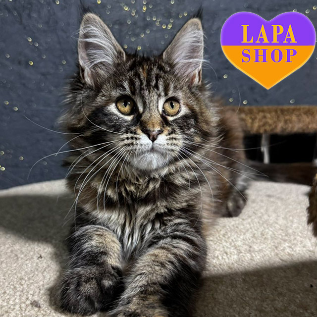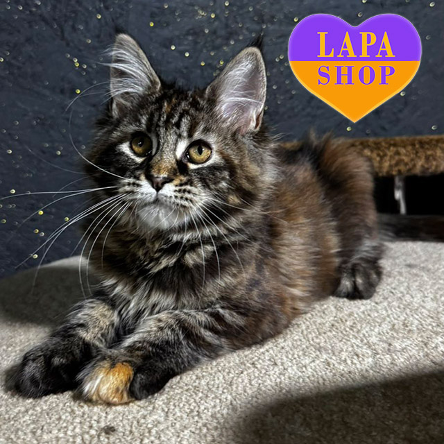 Usama — мейн-кун девочка с привлекательным окрасом чернаый черепаховый мраморный (f 22). Ее красивая шерсть и грациозный вид делают ее настоящим украшением дома.