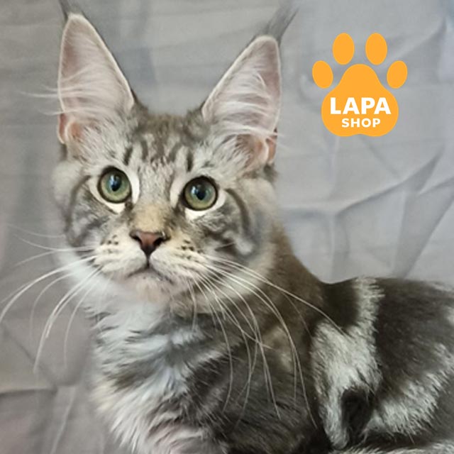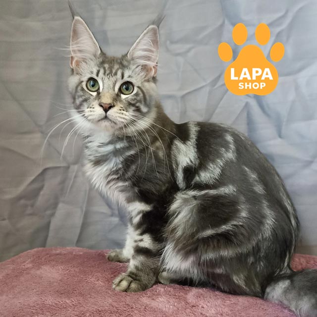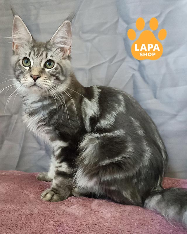 Xeveria – роскошная девочка породы мейн-кун с густой, блестящей шубкой серебристо-мраморного окраса.